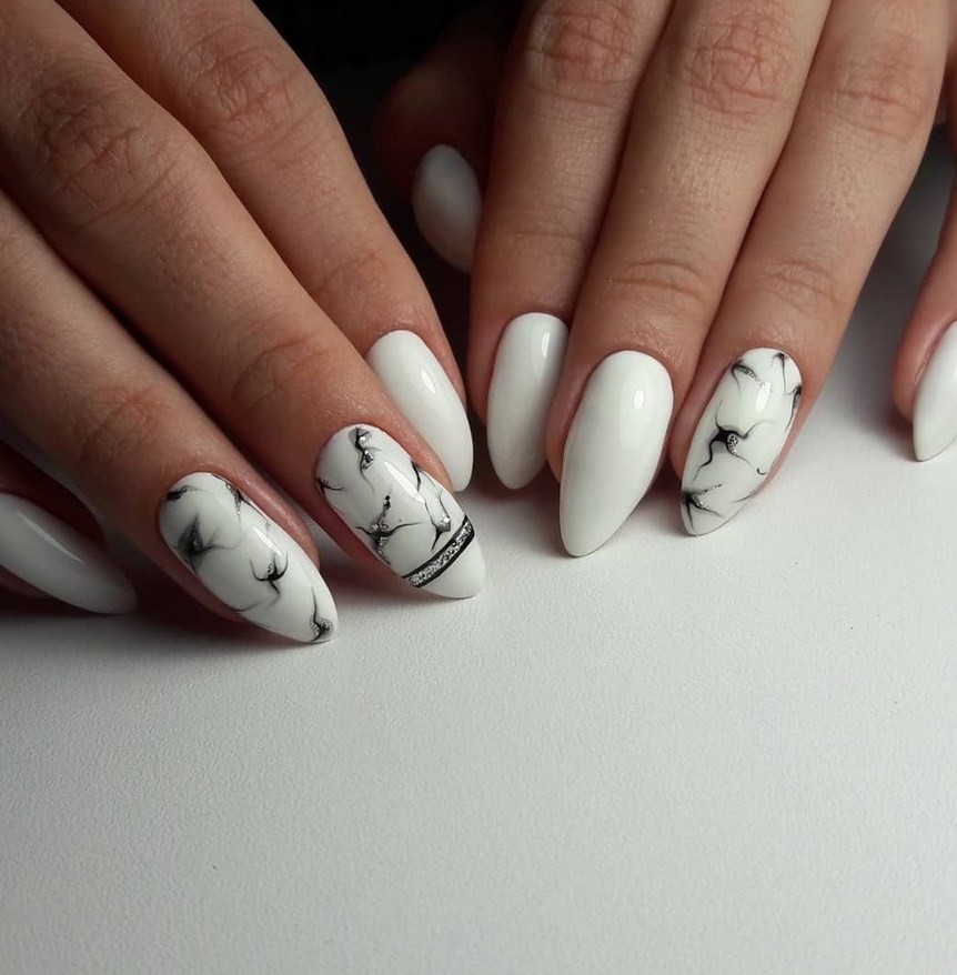 Классический белый – наилучшая основа, идеальный холст для изящных разводов. Белоснежная база с хаотичными полосками черного или бежевого цвета выглядит завораживающе и уникально. Если готовитесь к вечернему выходу, можно дополнить мрамор втиркой или глиттером. Особенно привлекательно будет смотреться пара «каменных» ноготков в тандеме с френчем.
