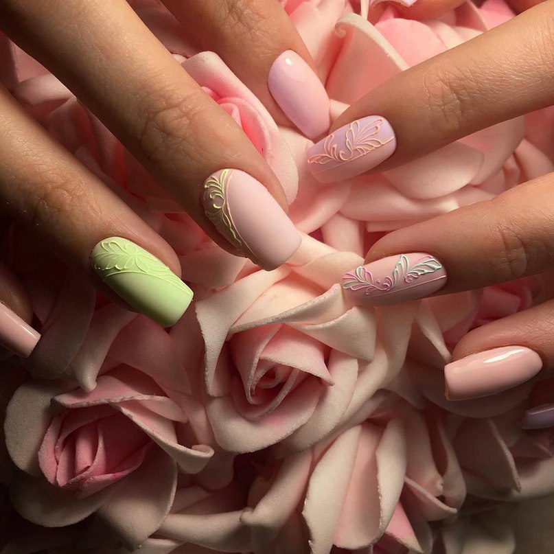 Подбирая дизайн свадебного маникюра, откажитесь от темных узоров и угловатых рисунков. Аккуратно сочетайте цвета, чтобы не перегрузить образ.