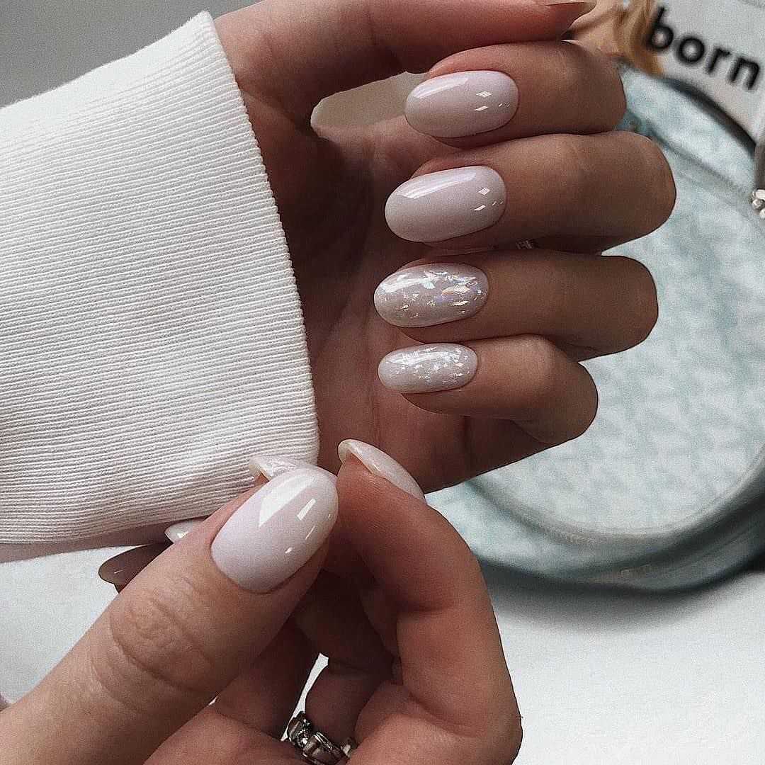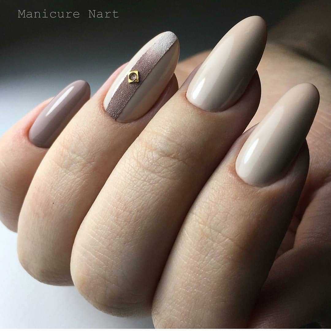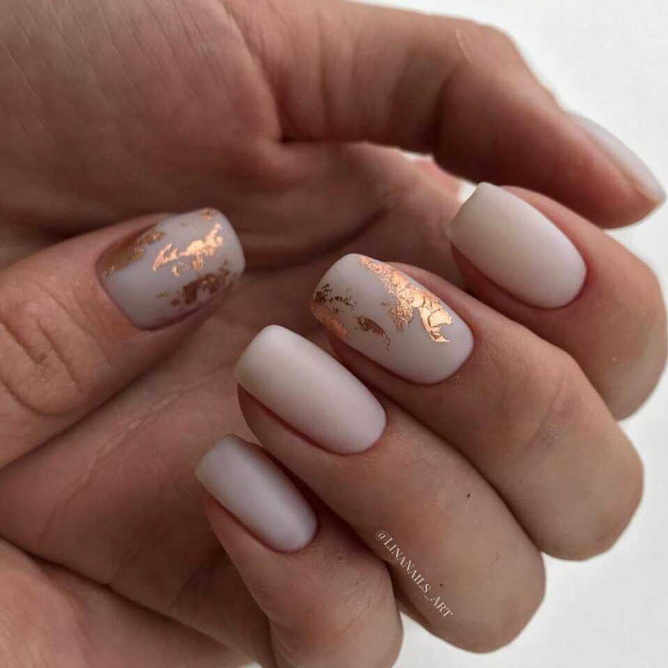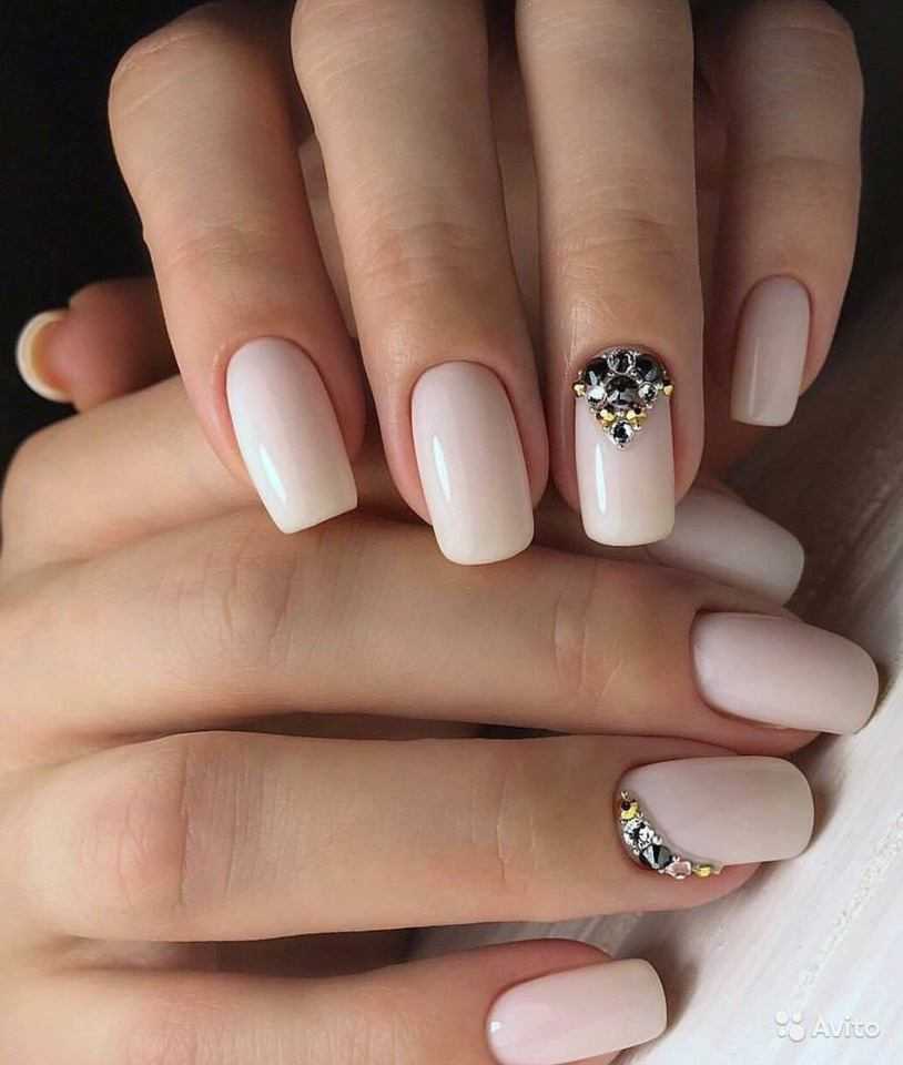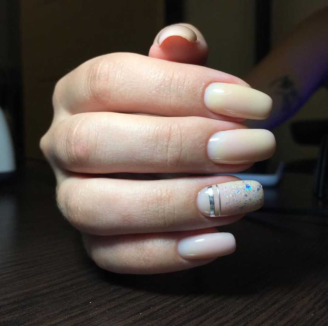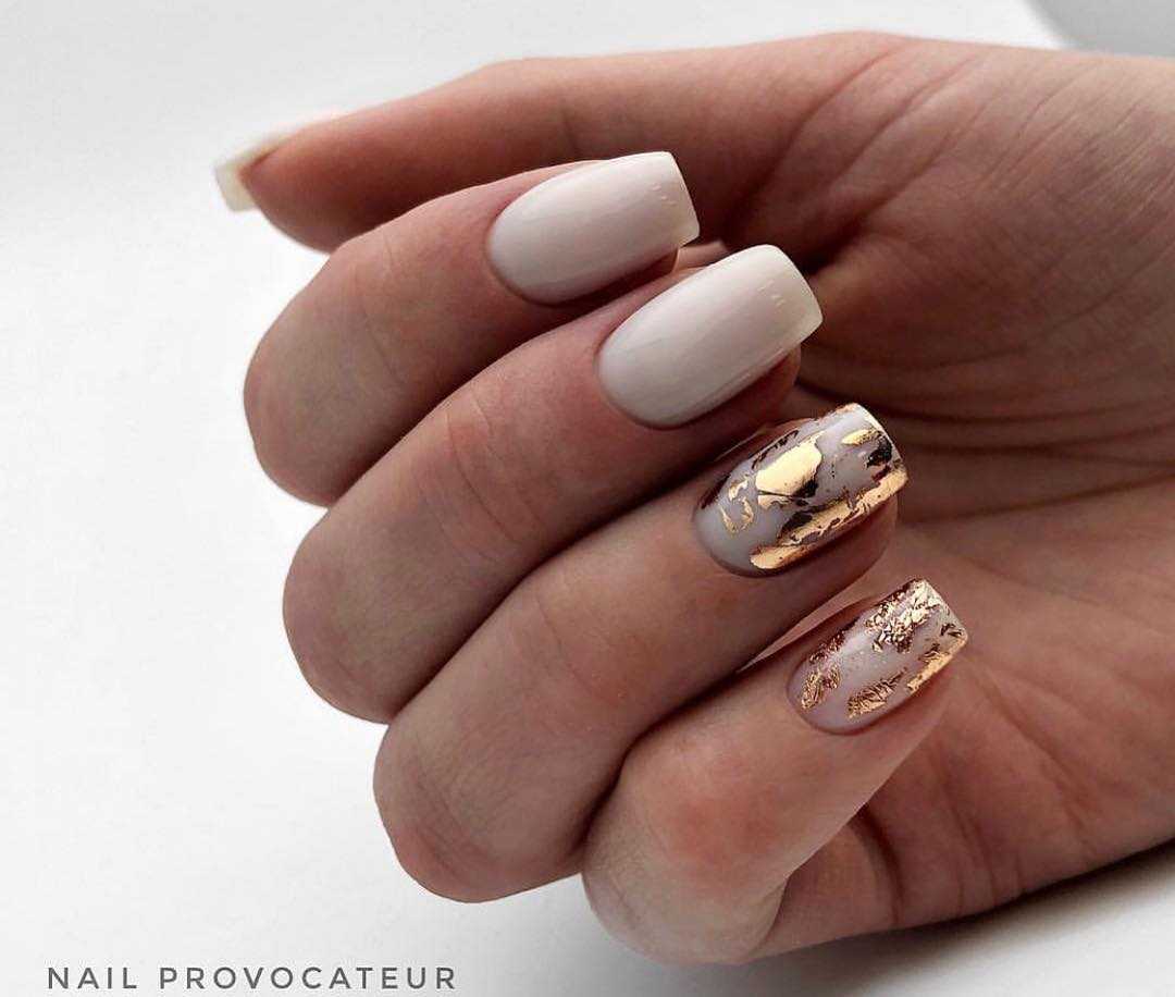 Молочно-бежевый маникюр — базовый. Для изюминки можно добавить золотистую или серебристую фольгу, камифубуки, стразы. Так как оттенки тёплые лучше отдать предпочтение золоту.