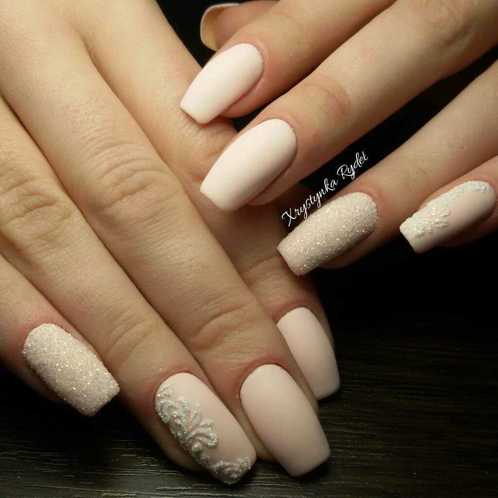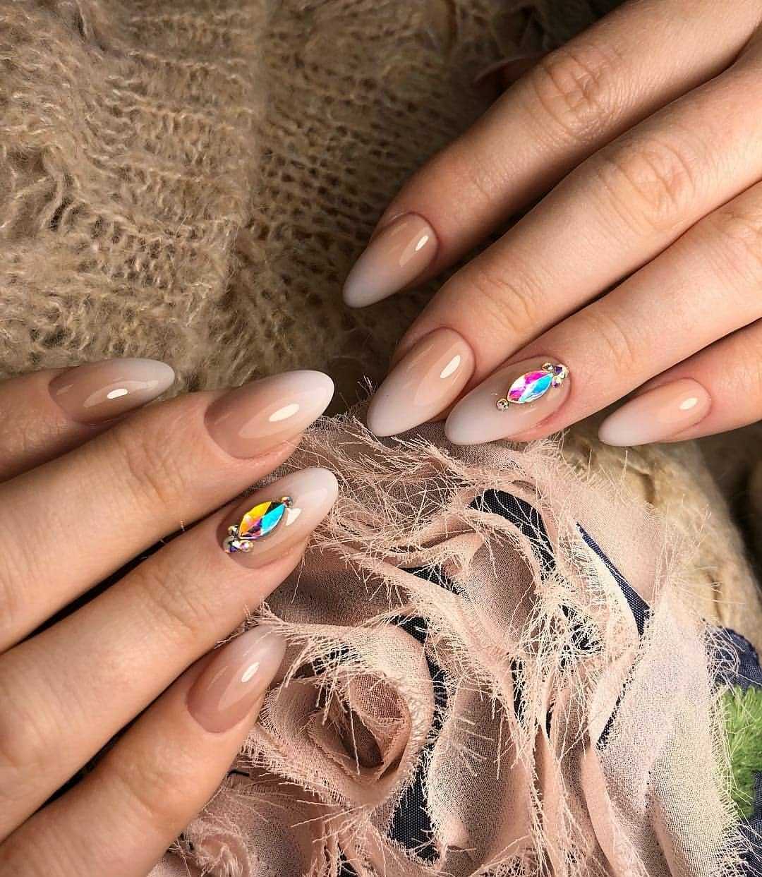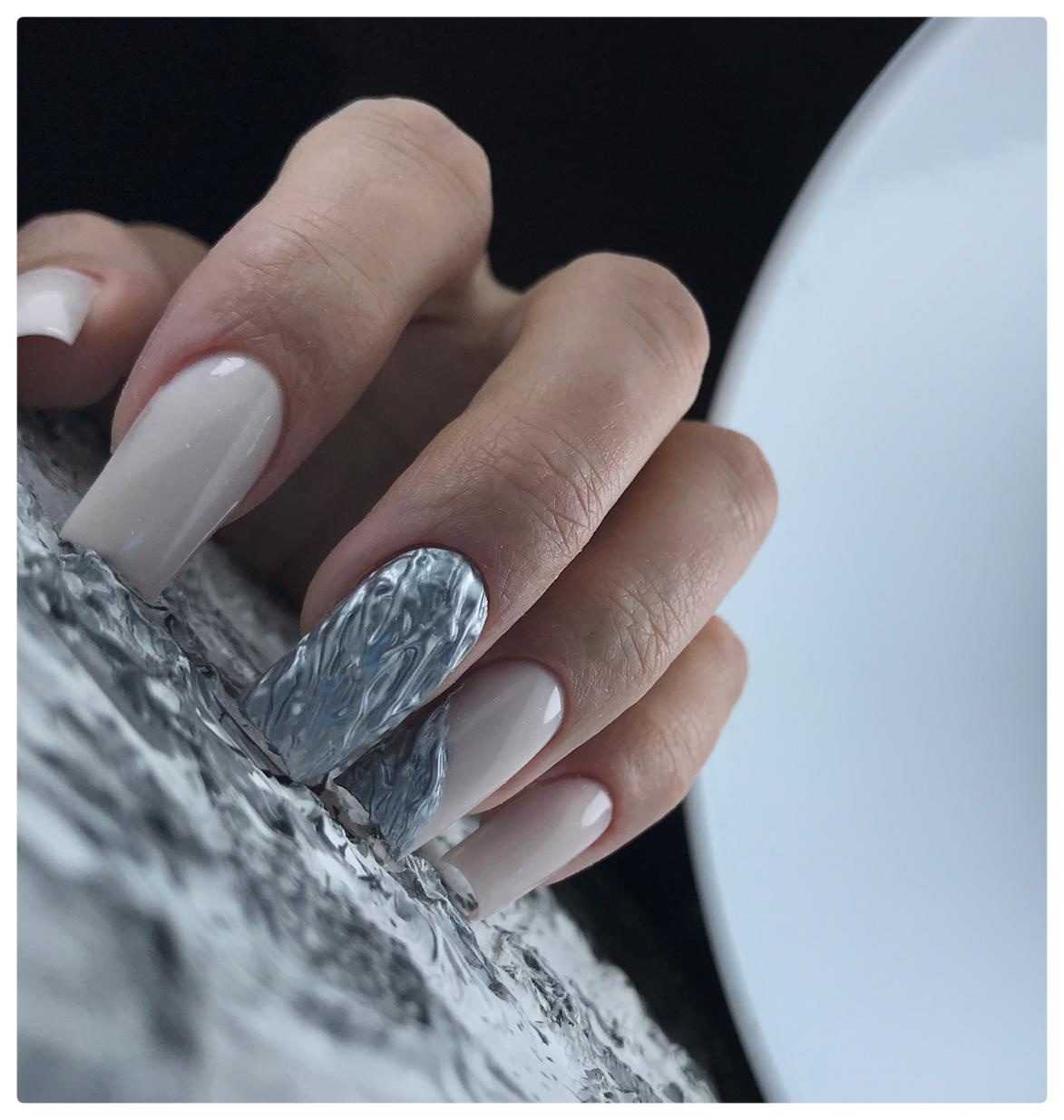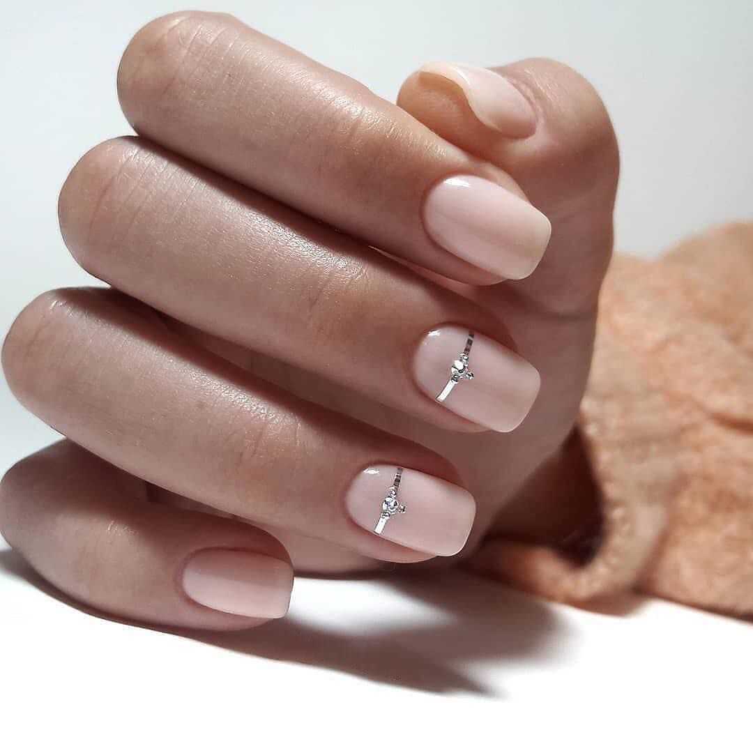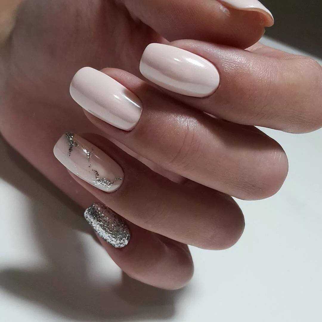 Молочно-бежевый маникюр — базовый. Для изюминки можно добавить золотистую или серебристую фольгу, камифубуки, стразы. Так как оттенки тёплые лучше отдать предпочтение золоту.