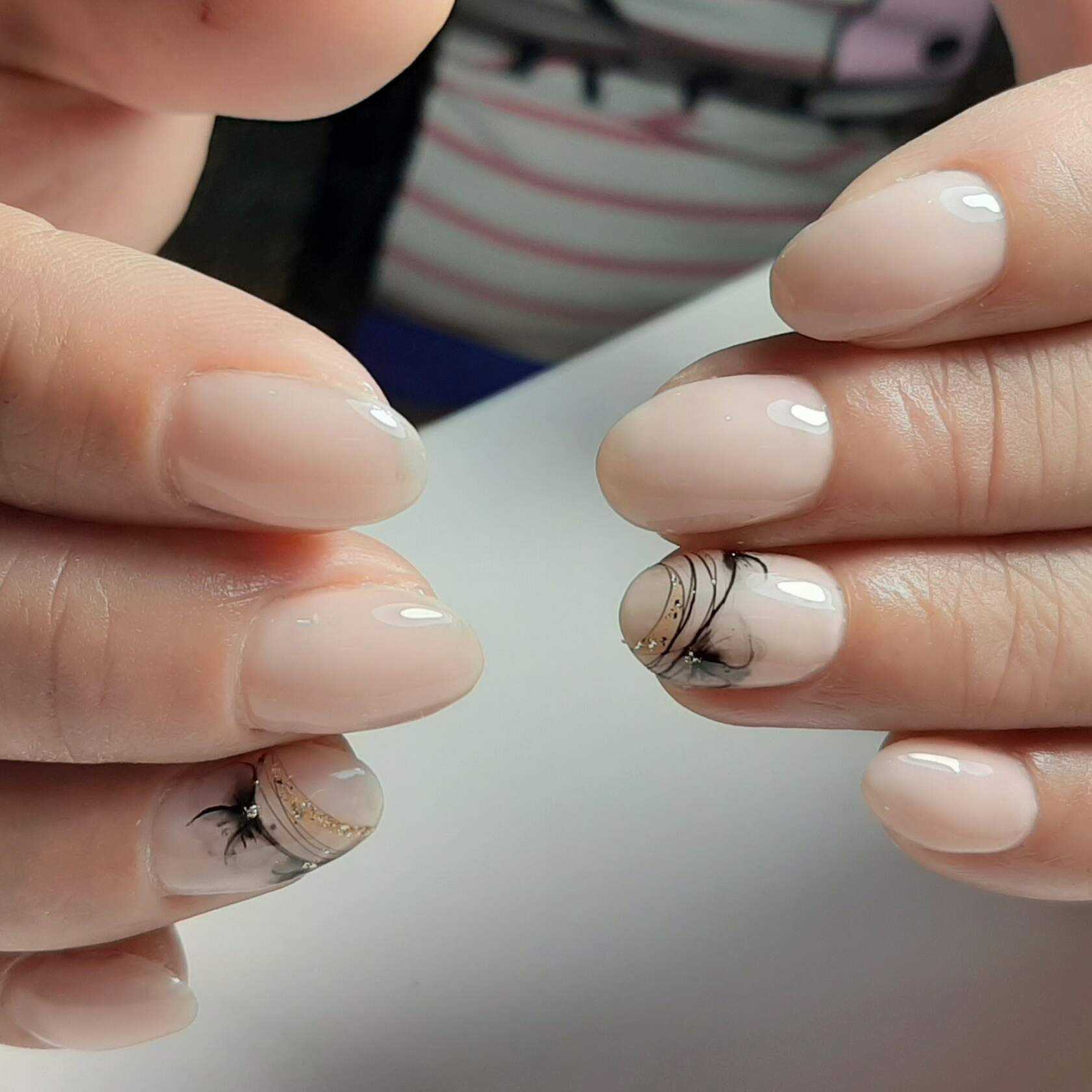 Дополнительным элементом декора становятся стразы, слюда, фольга камифубуки – в общем, все, чего пожелает твоя фантазия. Спокойный фон позволяет использовать яркий декор, оставляя маникюр сдержанным и утонченным.