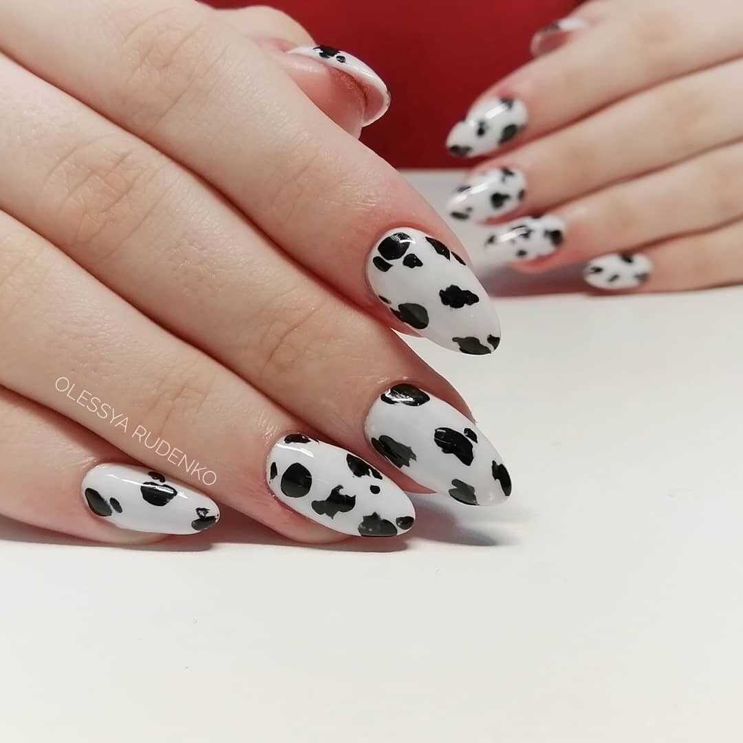 - Сочетание молочного покрытия ногтя и черного, т. е. когда один ноготь белый, другой черный, такая своеобразная шахматная доска.