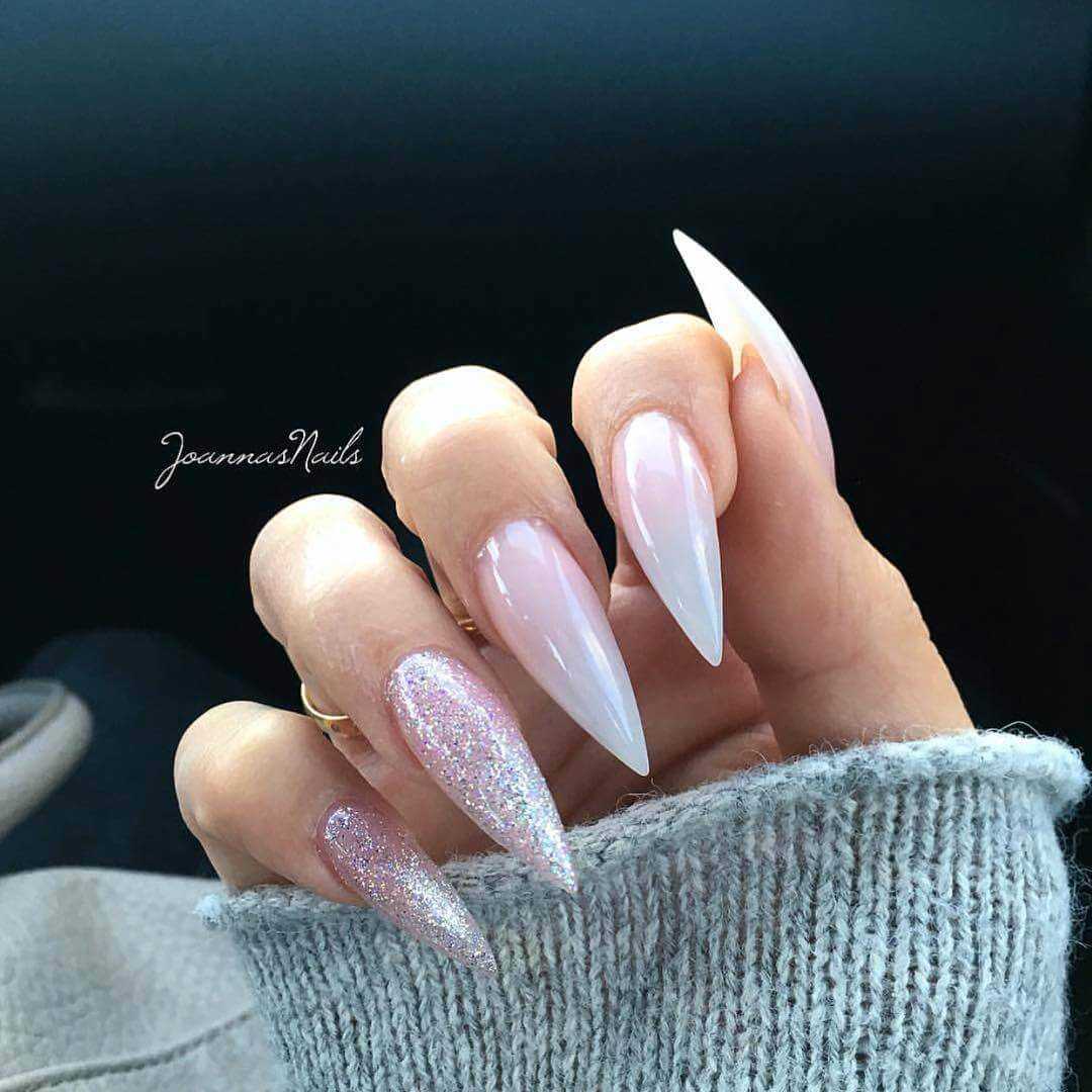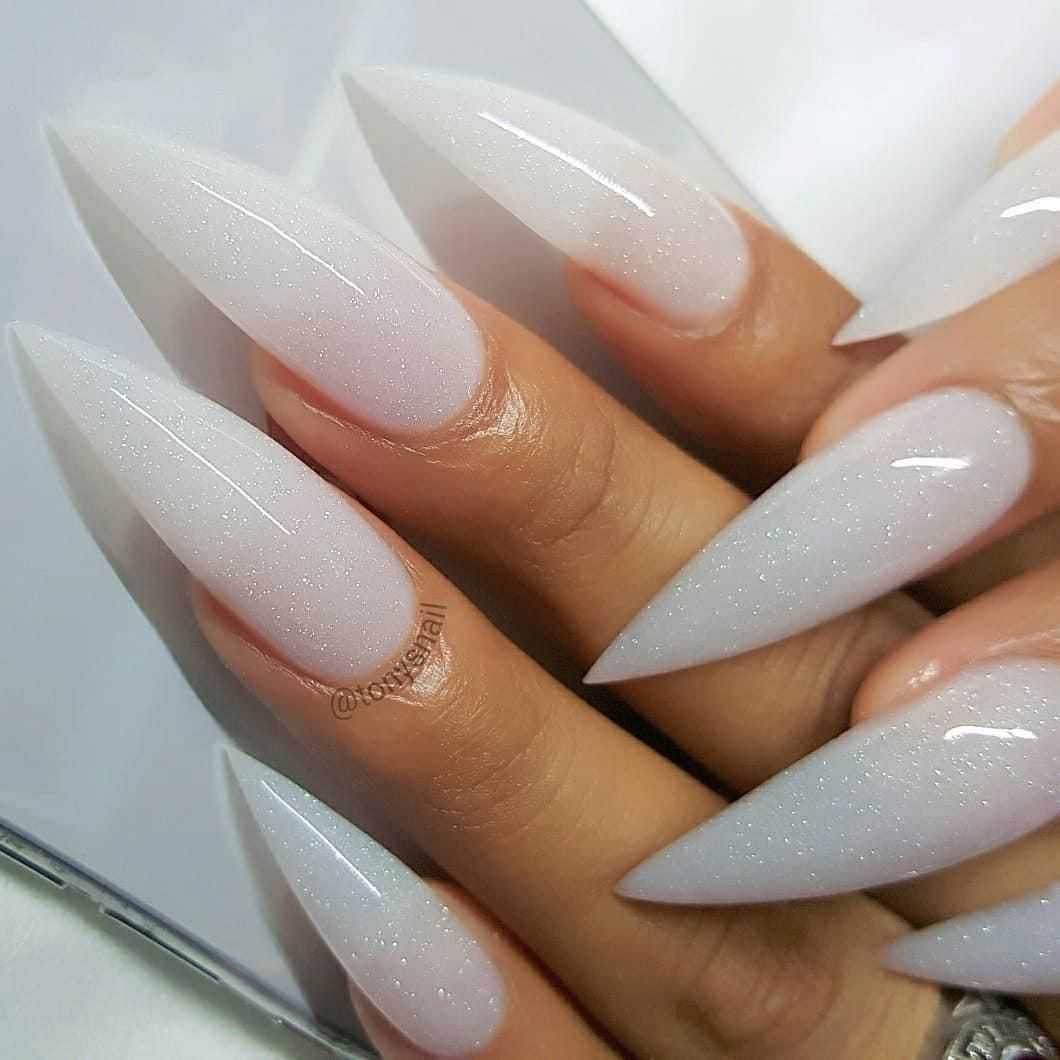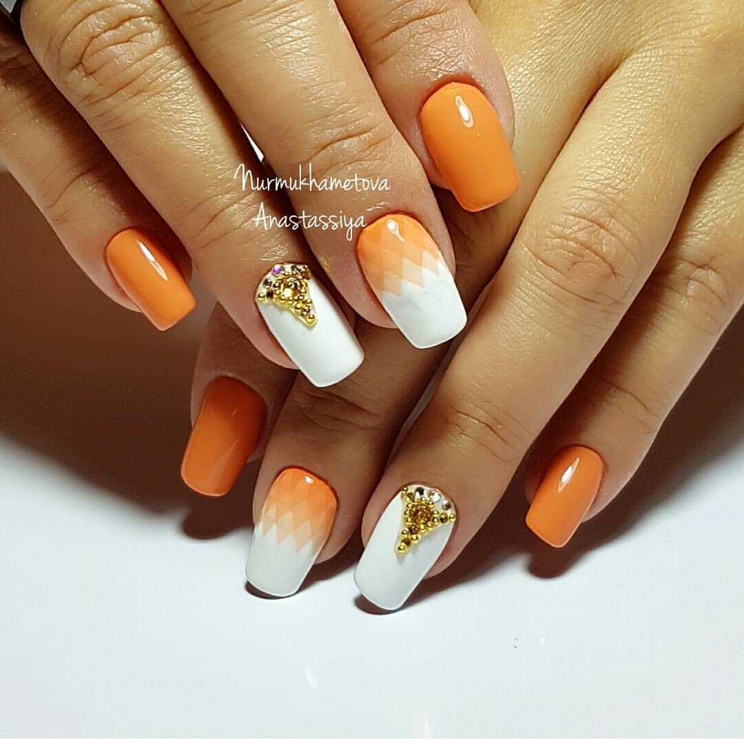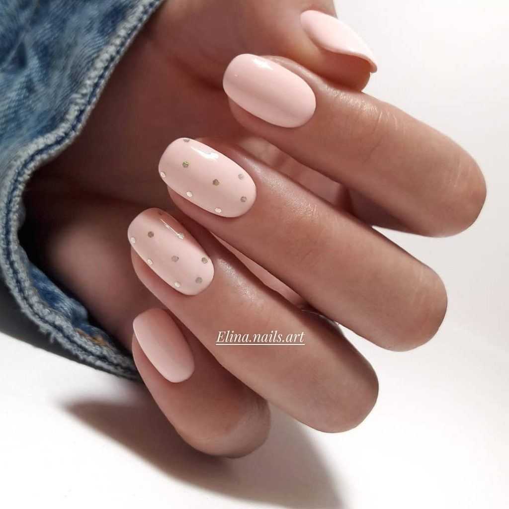 Ногти молочного цвета с блестками – это самый шикарный вариант маникюра в нюдовой палитре! Удачным выбором декора будет роскошное золото и сверкающие акценты оранжевой палитры. Такие цвета делают молочный цвет более свежим и привлекательным. Розовое золото – еще одна великолепная компания для такого покрытия.