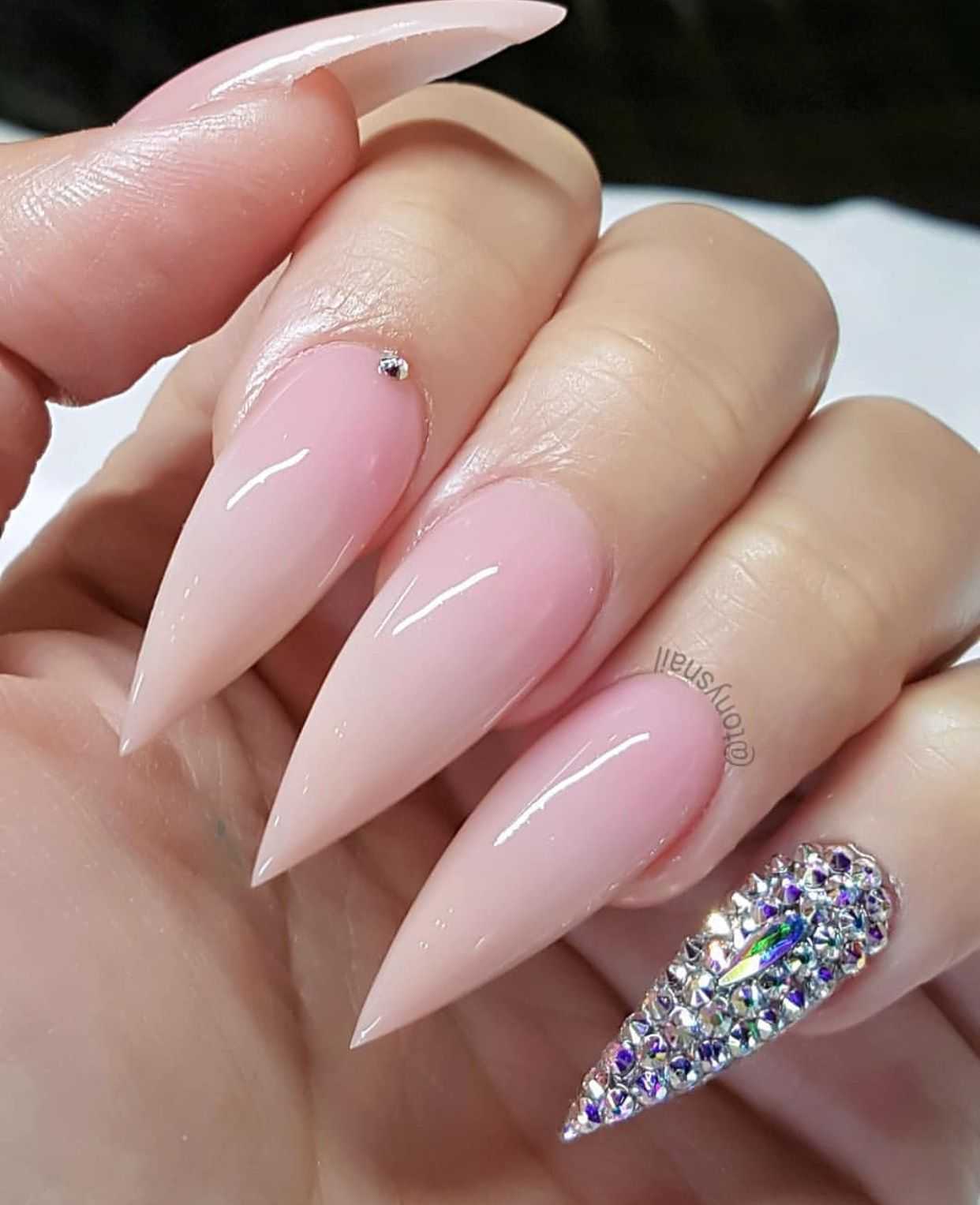 Яркая идея для вечеринки – это обилие страз на одном ноготке и лаконичная фигура на другом. Такая инкрустация из сверкающего декора точно не оставит вас без внимания!
