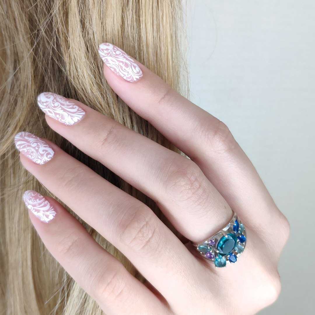 Классический вариант — белый френч на прозрачной базе. Оригинальным вариантом станут белые геометрические узоры, стемпинг.