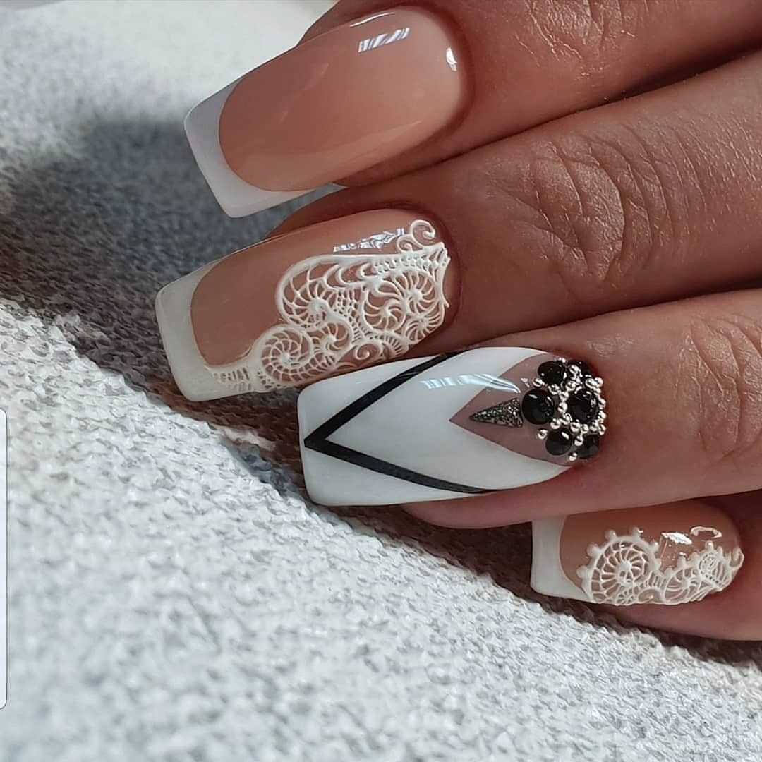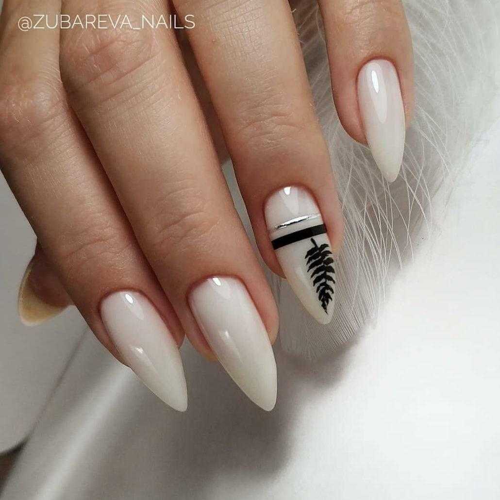 Молочный маникюр, как очень близкий к белому цвету хорошо гармонирует с черным цветом. Эта палитра – черное и молочно-белое всегда в моде и не утрачивает своей актуальности. Еще один важный момент в такой технике маникюра – он прекрасно подходит для офисного работника или же для женщины занимающейся бизнесом. Есть несколько идей такого маникюра.