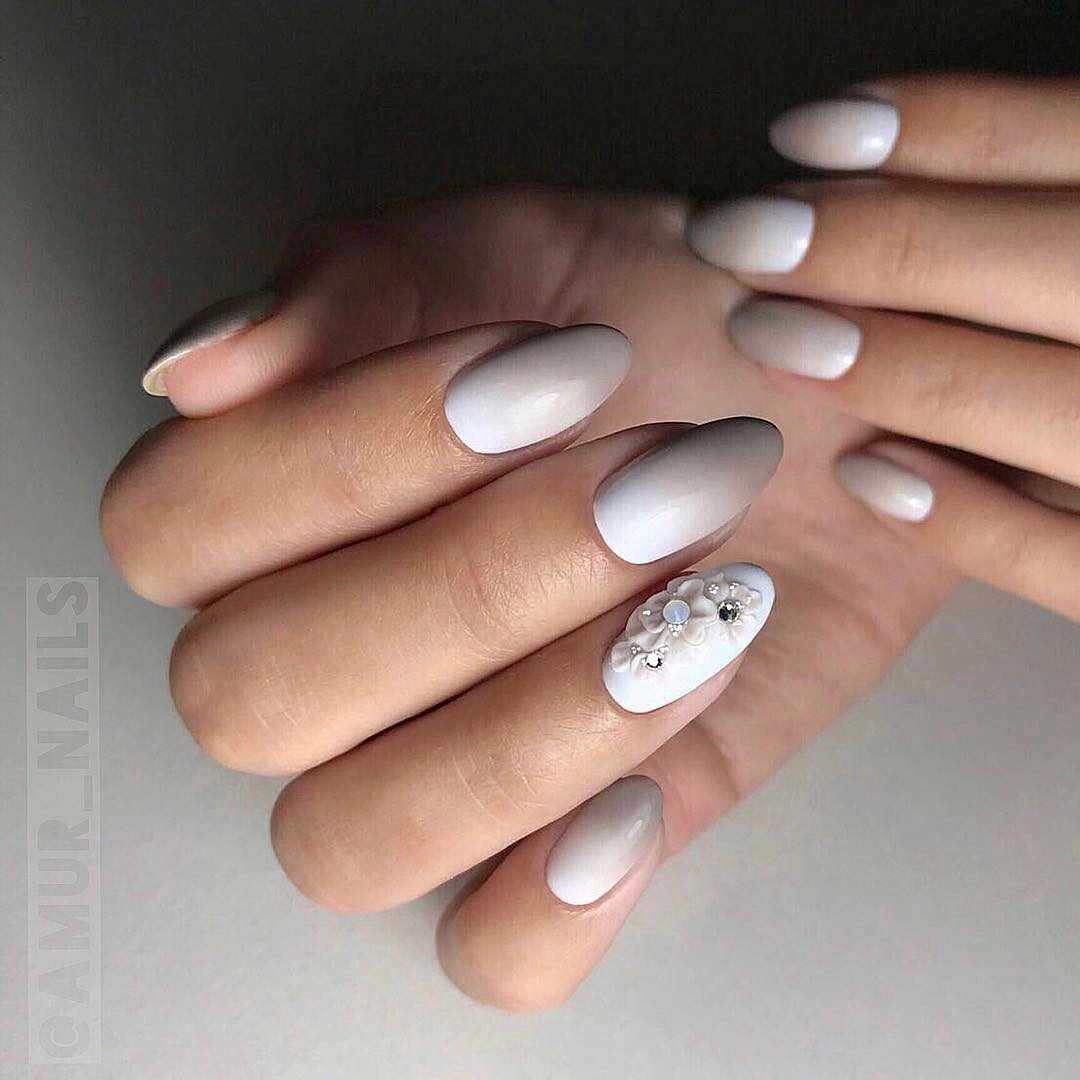 Бело-молочные оттенки настолько притягательны и самодостаточны, что для создания красивого, легкого дизайна хватает одного лака. Его наносят в несколько слоев, просушивают. Покрытие может иметь глянцевую или матовую фактуру, легкий градиент в одной тональности.