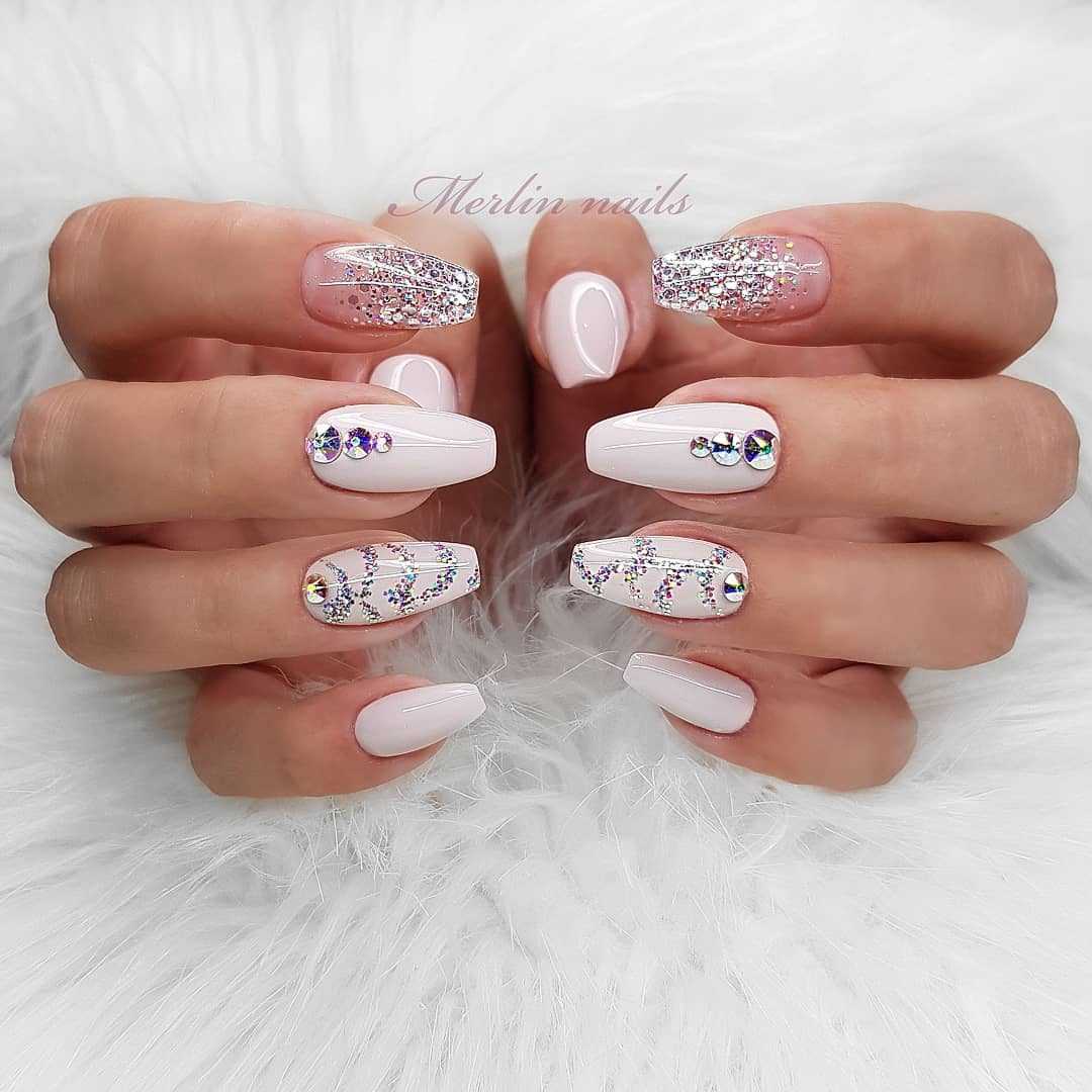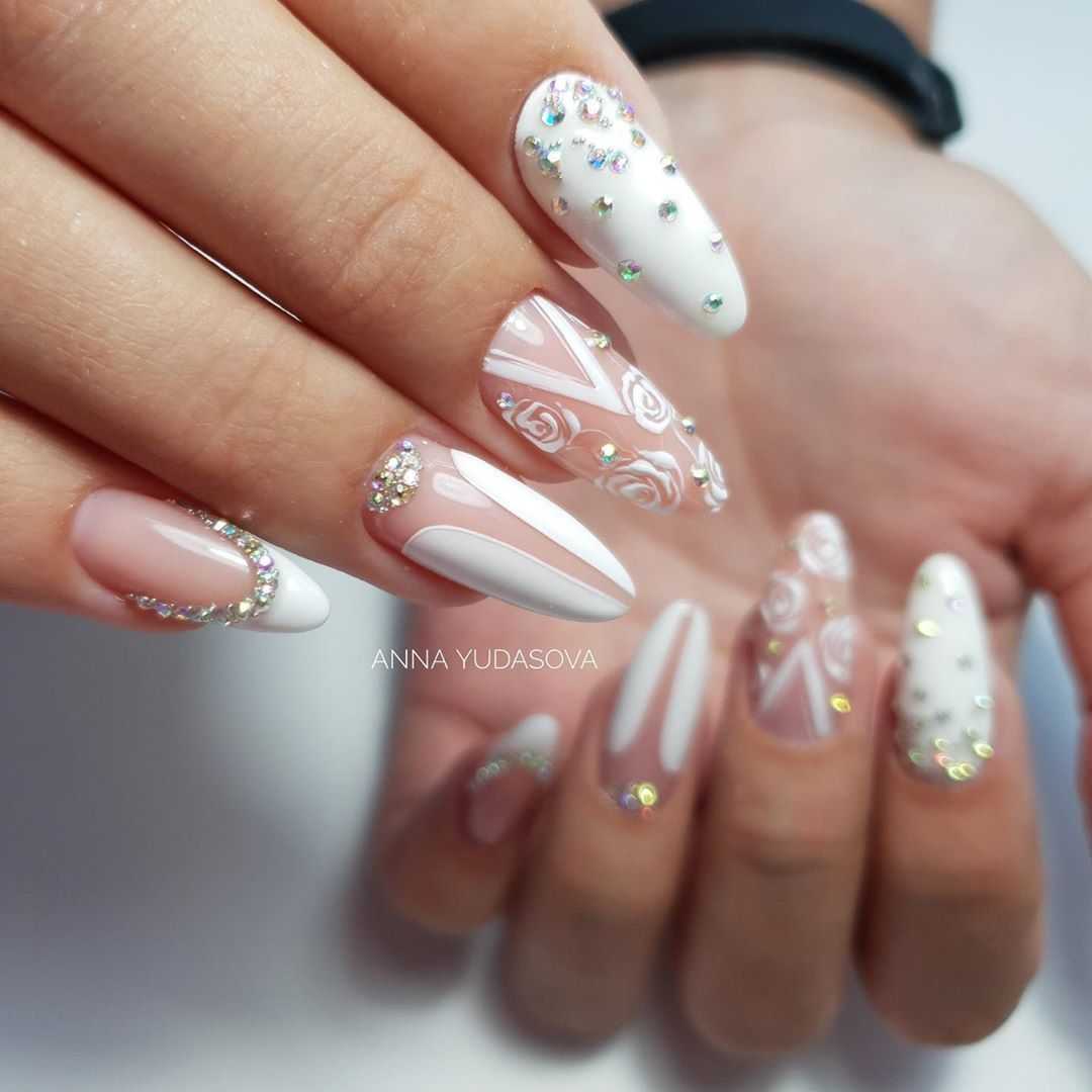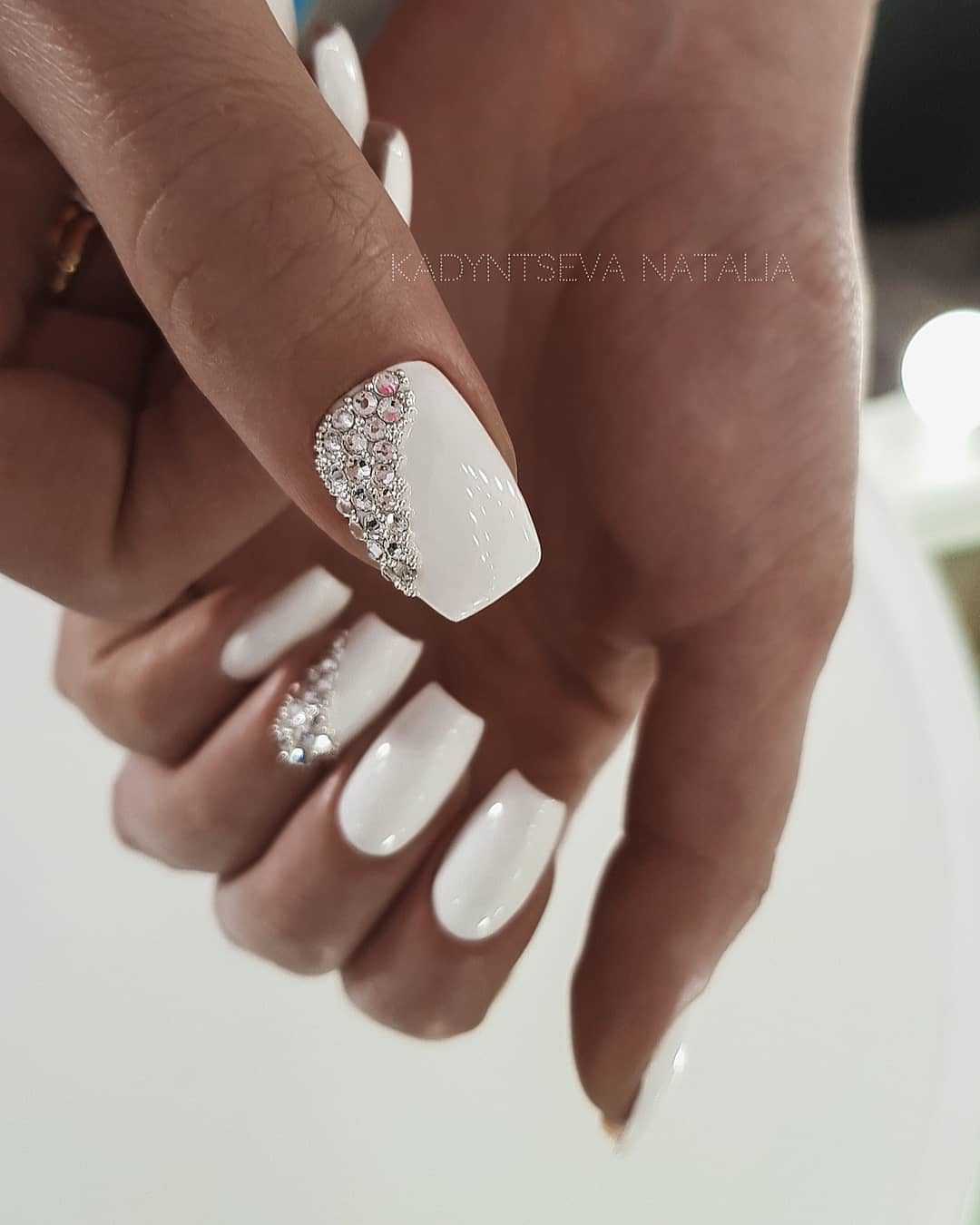 Молочный маникюр со стразами – это олицетворение роскоши и торжественности. Однако этот праздничный декор сегодня активно используется и в повседневном дизайне ногтей. Главное условие его успешности – это умеренность блестящих акцентов.
