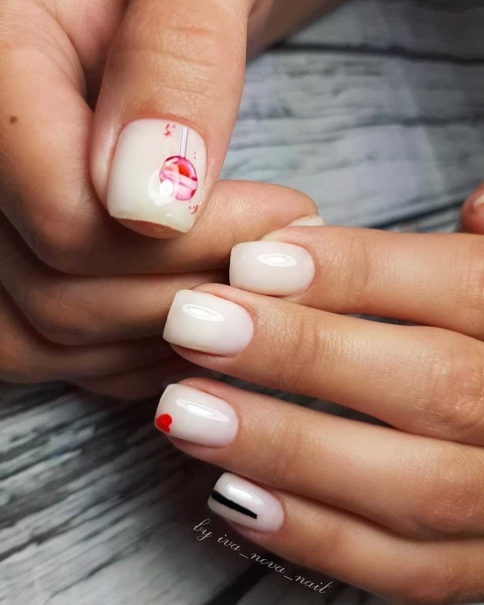 Особенно эффектно на молочном фоне смотрятся красные цветы и сердечки. Неплохо выглядит и градиент, когда молочный фон постепенно переходит в красные оттенки или наоборот. Красный френч на ногте молочного цвета сделает руки более выразительными.