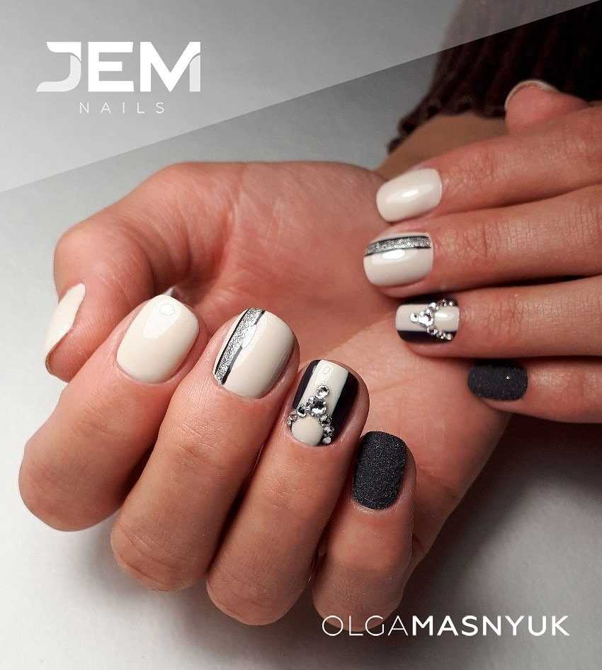 - Чередование в следующем стиле: один ноготь черная и молочная полоса, другой на молочном фоне черный горошек.