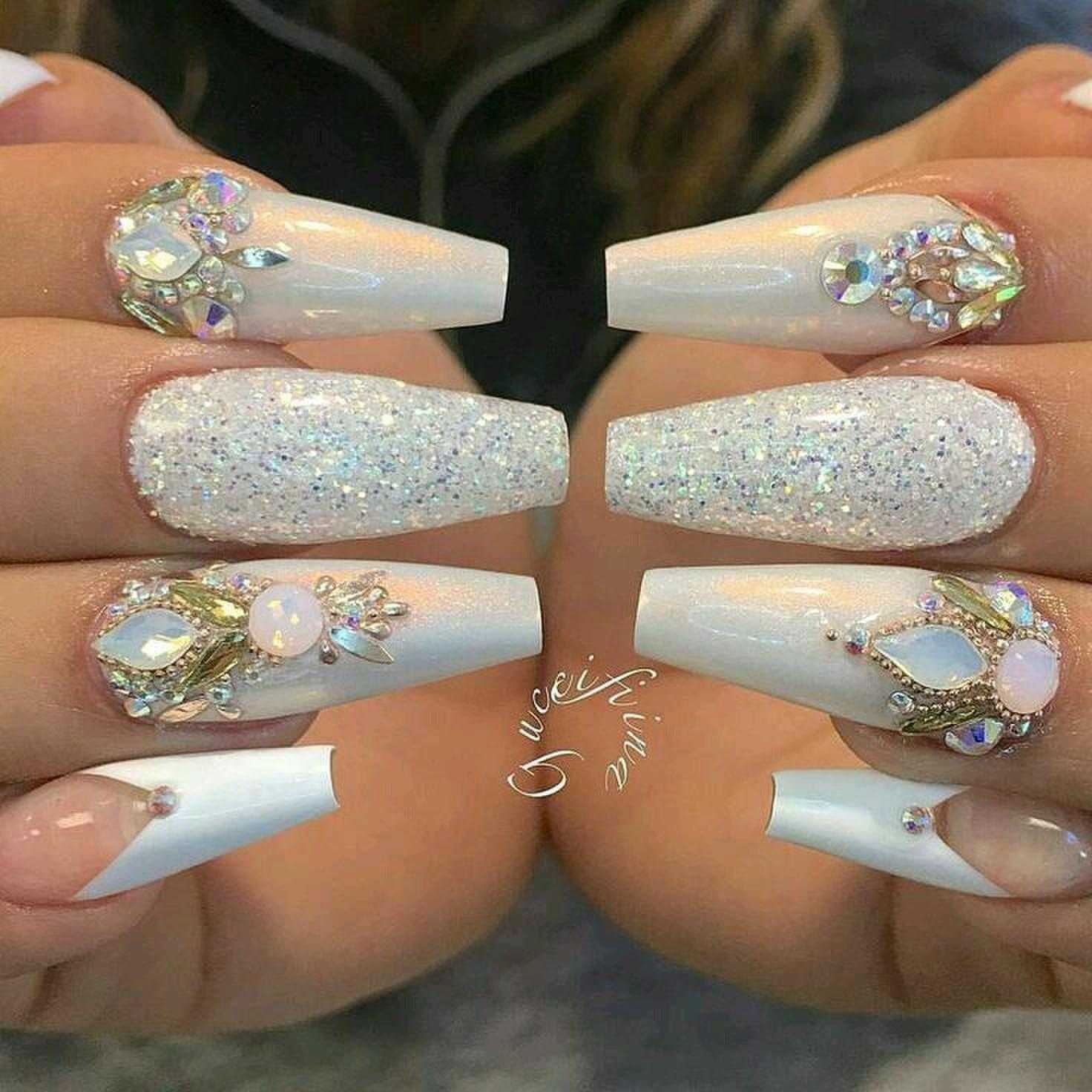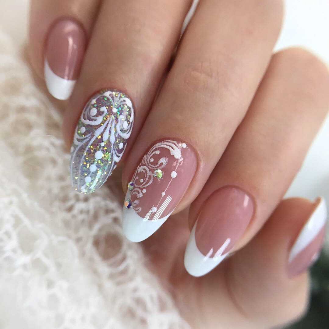 Вариантов использования сверкающего декора великое множество! Конечно, это классика – лунка или улыбка френча, или лунного дизайна. Также можно украсить 4 ноготка молочным лаком, а один феерично покрыть золотым глиттером. Среди трендовых идей также фигурируют блестящие узоры и геометрия.