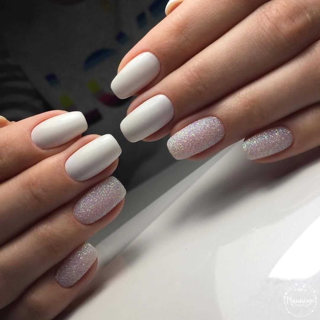 Матовый маникюр в молочном воспроизведении прекрасно гармонирует с лиловыми и розовыми оттенками. Экспериментируйте с пастельной палитрой, а также не забывайте про эффектное сочетание с блестящими акцентами.