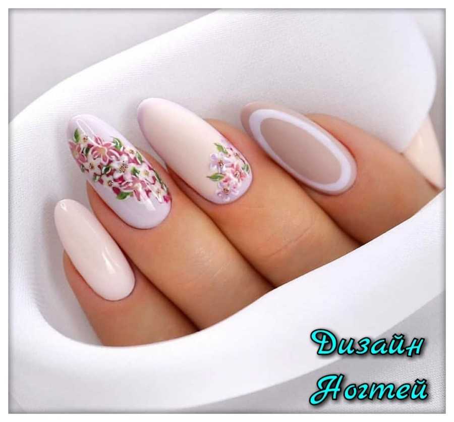 Дизайн ногтей молочного цвета с рисунком выполнить несложно. Вариантов несколько: можно составить сложную композицию. В этом помогут рисунки, стразы, втирка, фольга или блестки. На овальных ногтях выигрышно смотрятся несколько рисунков одновременно. Летом можно изобразить яркие цветы, зимой — снежинки или елочки.