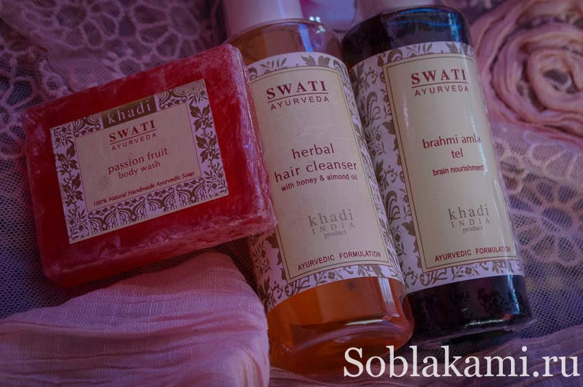 - Khadi. Эта марка принадлежит компании, выпускающей «Свати». Разница в том, что Кхади делается вручную. Тут вам и массажные ароматические масла, и травяные лосьоны с гелями, и шампуни с мылом.