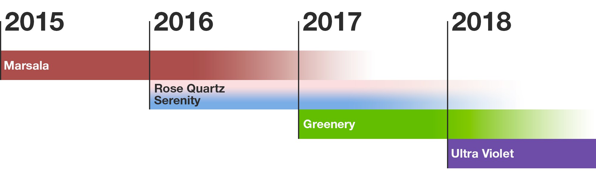 - -2 года — сотрудники Института Цвета Pantone в общении с дизайнерами-трендсеттерами и прочими творцами начинают замечать и фиксировать определённые цветовые закономерности.