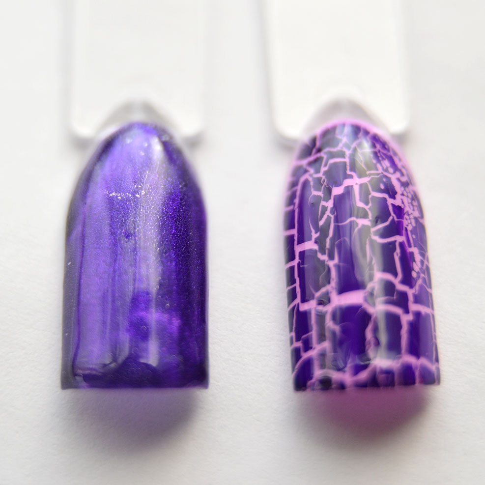 - На гель-лаке с липким слоем другого производителя кракелюр проявился также хорошо, как и на родной специальной подложке (правая типса), а значит, покупать их в комплекте совершенно не обязательно!