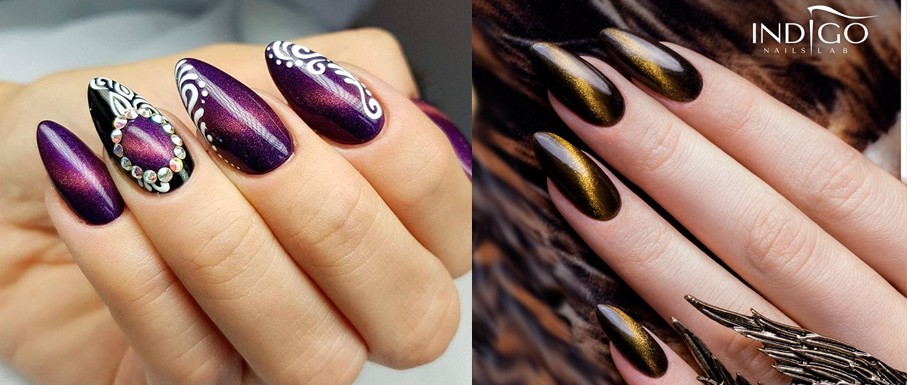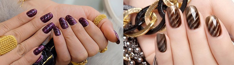 Популярным в этом сезоне остается дизайн ногтей с покрытием ногтей гель-лаком в стиле кошачий глаз. Для его создания используется специальный магнитный гель-лак, в состав которого входят металлические микрочастицы. При помощи магнита они приводятся в действие и соединяются в узор. Но главной достопримечательностью этой техники является излучение света из глубины. Он обладает магическим переливом цветов. Такого эффекта невозможно добиться при использовании обычного гель-лака. Очень эффектно и шикарно смотрится такая техника в зеленом, янтарном, оливковом тонах.