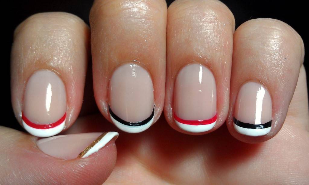 - если не хочется сделать ноготь еще более коротким, то не надо использовать похожие цвета — пусть линии будут контрастными;