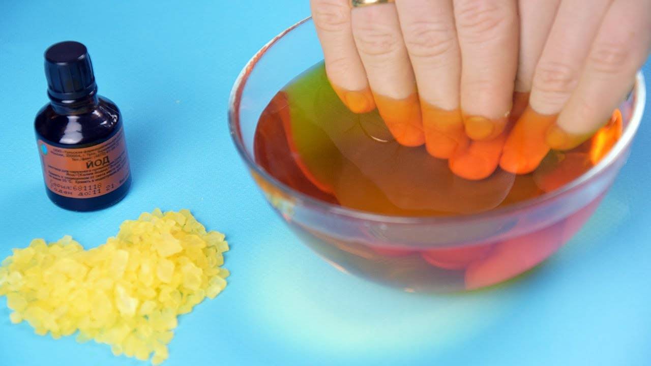 Рецепт №1. Сделайте теплые ванночки с йодом и обычной поваренной солью. Возьмите 0,5 литра воды и подогрейте, растворите 2 ст. ложечки соли, а потом добавьте в ванночку 10 капелек йода. Около 15 минут подержите в растворе руки. Ванночка поможет укрепить ногти и ускорить их рост.