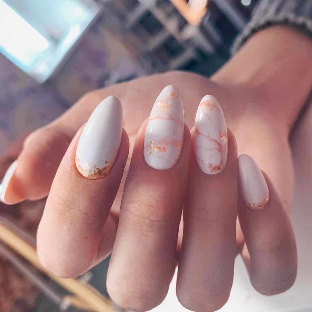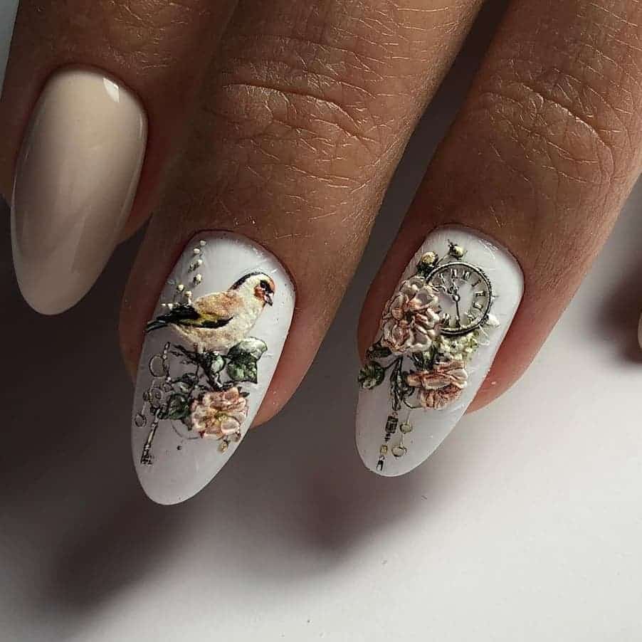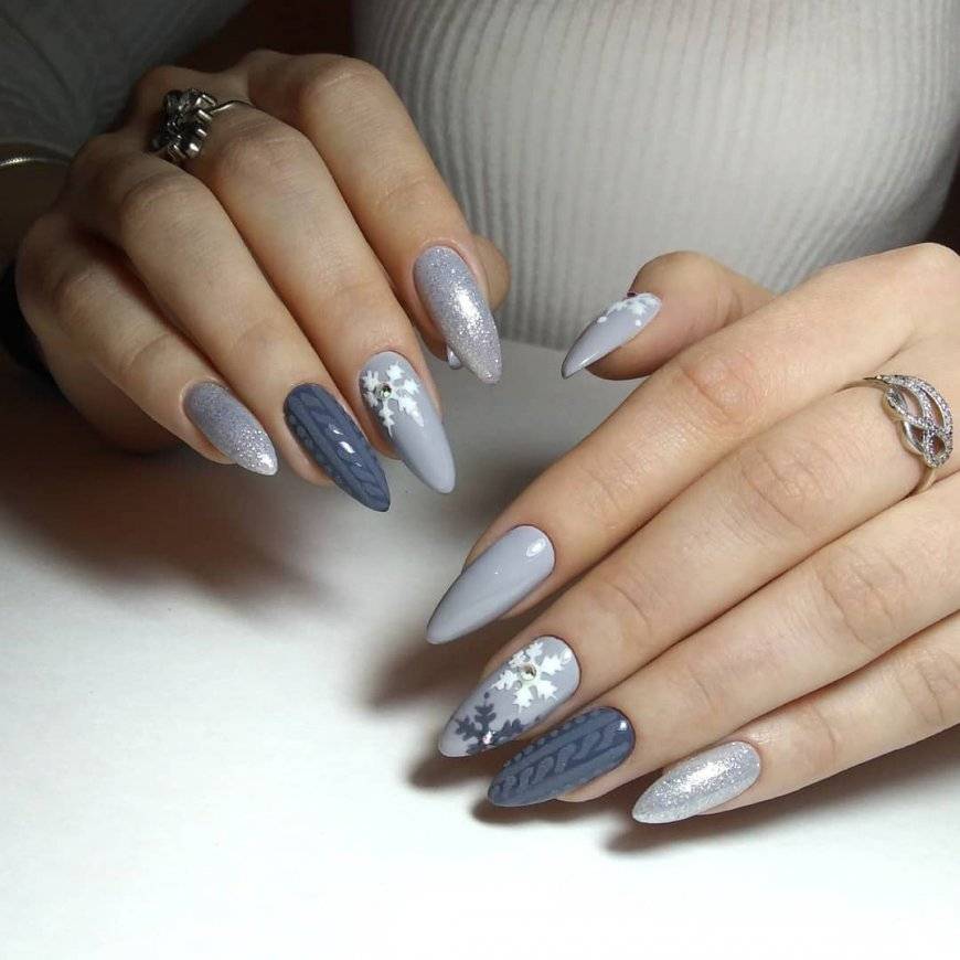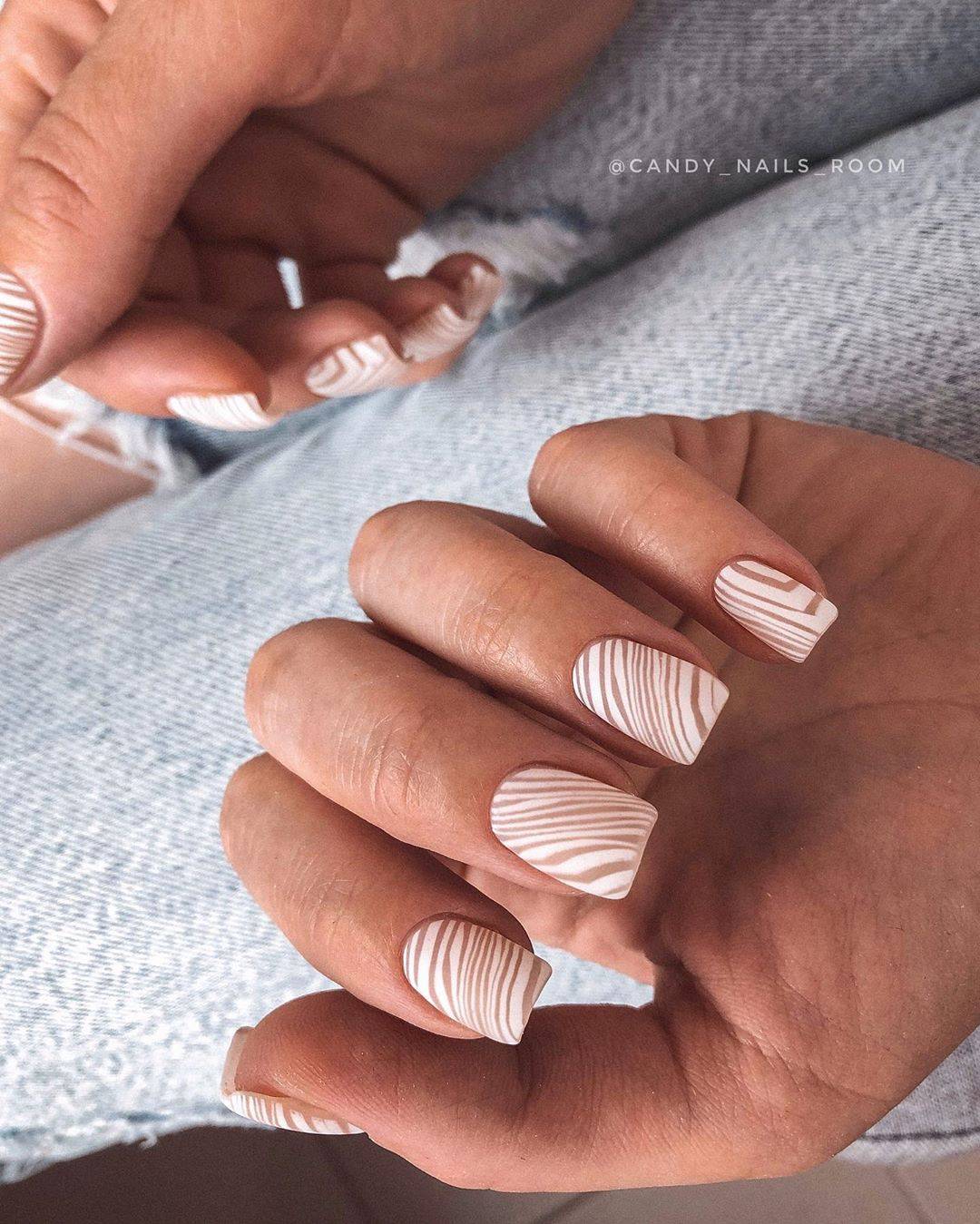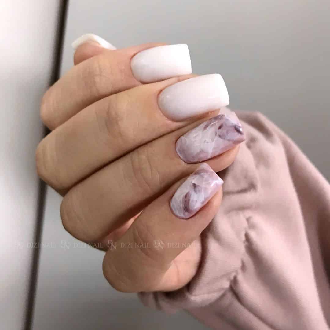 Модная техника получила в 2021 новое прочтение – микс узоров разных оттенков на одном ногте. Для реализации этой идеи берите хорошо сочетающиеся оттенки (например, молочный, розовый и серый).