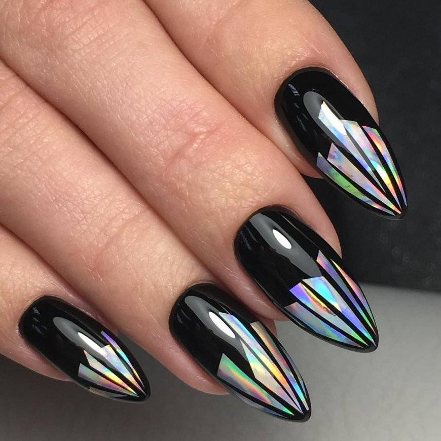 Длинные ногти позволяют сделать покрытие ноготков лаком тёмного цвета с блёстками, при этом лунку можно не закрашивать. Ещё один тренд сезона – маникюр в стиле «битое стекло». По-другому его ещё называют зеркальным. При этом дизайне лунку или вообще не закрашивают, или покрывают прозрачным лаком. На ноготок накладывают кусочки фольги или голографической пленки. Сверху маникюр покрывают топом.