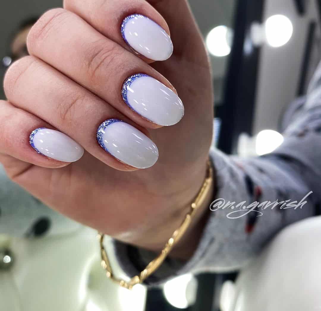 Очень современно и оригинально будет выглядеть блестящий французский маникюр на длинных острых ноготках или на ноготках формы балерина.