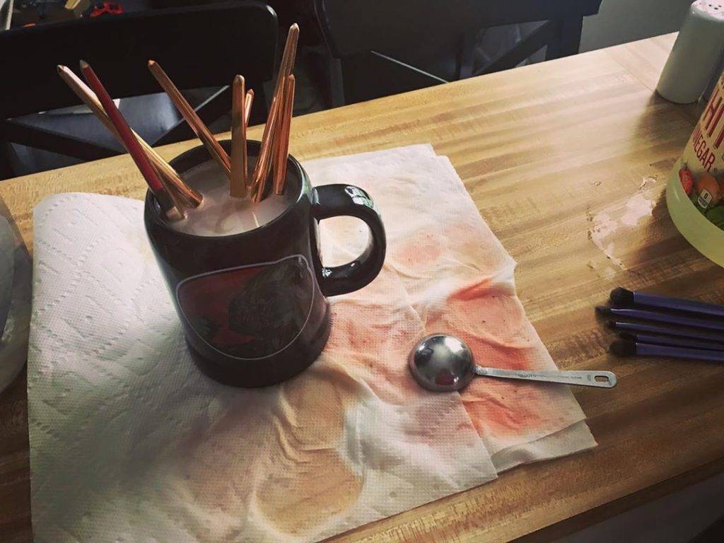 Вылейте содержимое чаши в пустую бутылку при помощи воронки. Погрузите в очищающее средство ваши кисти. После замачивания немного почистите щетки, промойте их, пока вода не станет чистой. Разложите кисти на чистом полотенце, дав им высохнуть.