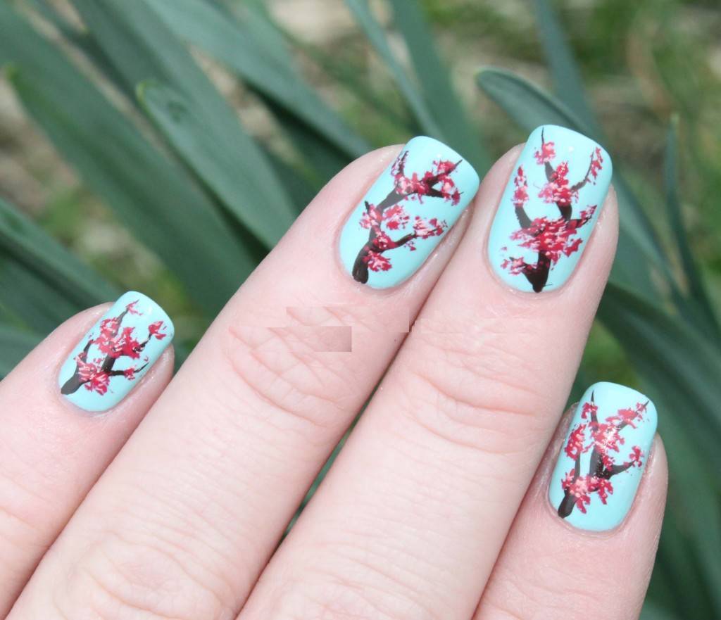Остальные ноготки стоит украсить столь модными в этом сезоне горошками или сделать френч с тем же голубым или синим лаком. Скромненько и со вкусом. Идей цветочного маникюра много.