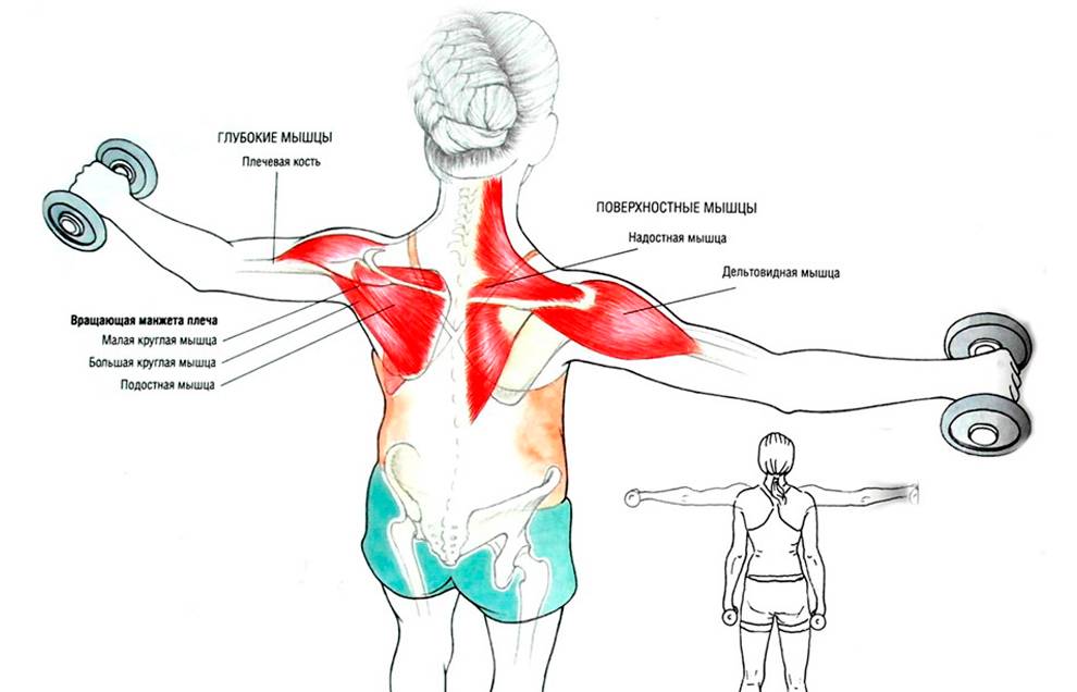 Качественное поднятие выпрямленных рук в таком режиме позволит полностью проработать все мышцы верхнего отдела спины. Вам понадобиться немного простора для разведения рук в стороны, но никакого дополнительного инвентаря кроме гантелей не потребуется.