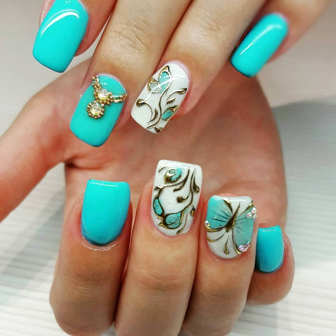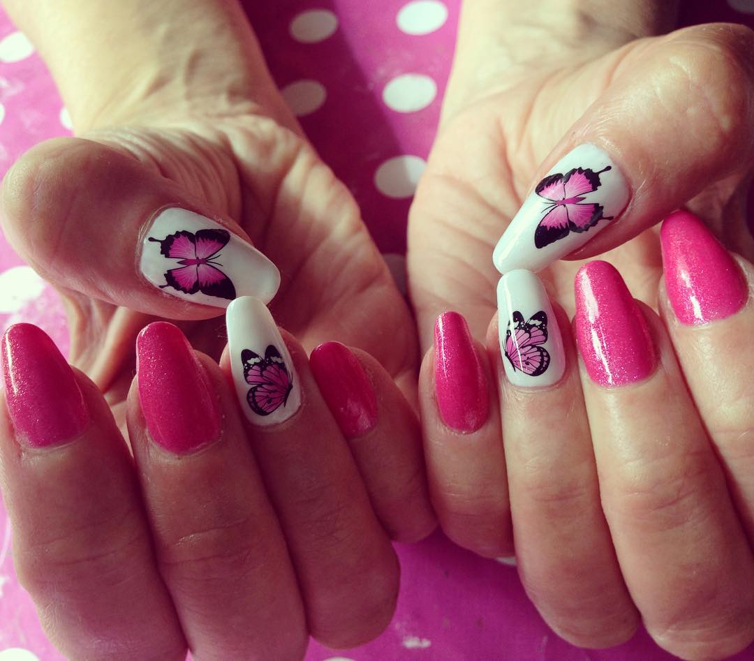 Нарощенные ноготки – огромная площадка для воплощения самых интересных идей. На длинных ногтях практически все рисунки смотрятся хорошо. Единственное, при выборе узора стоит учитывать форму ногтей. Лучше всего смотрится бабочка на прямоугольных ногтях.