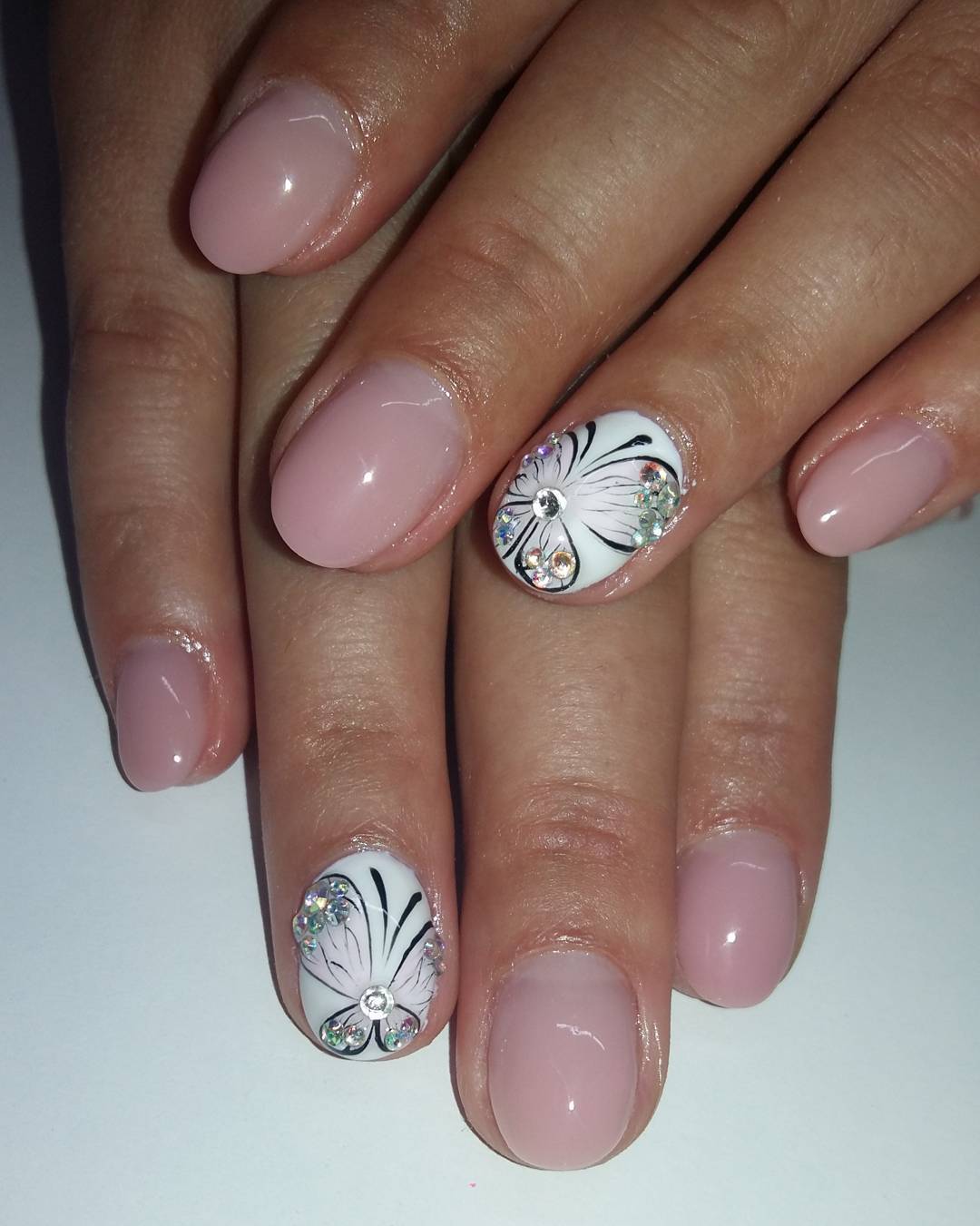 Если такой дизайн вам кажется слишком скучным, вы можете добавить в маникюр мелкие светлые цветы, которые будут не сильно выделяться из общего рисунка. Помните, что бабочка – основной элемент маникюра.