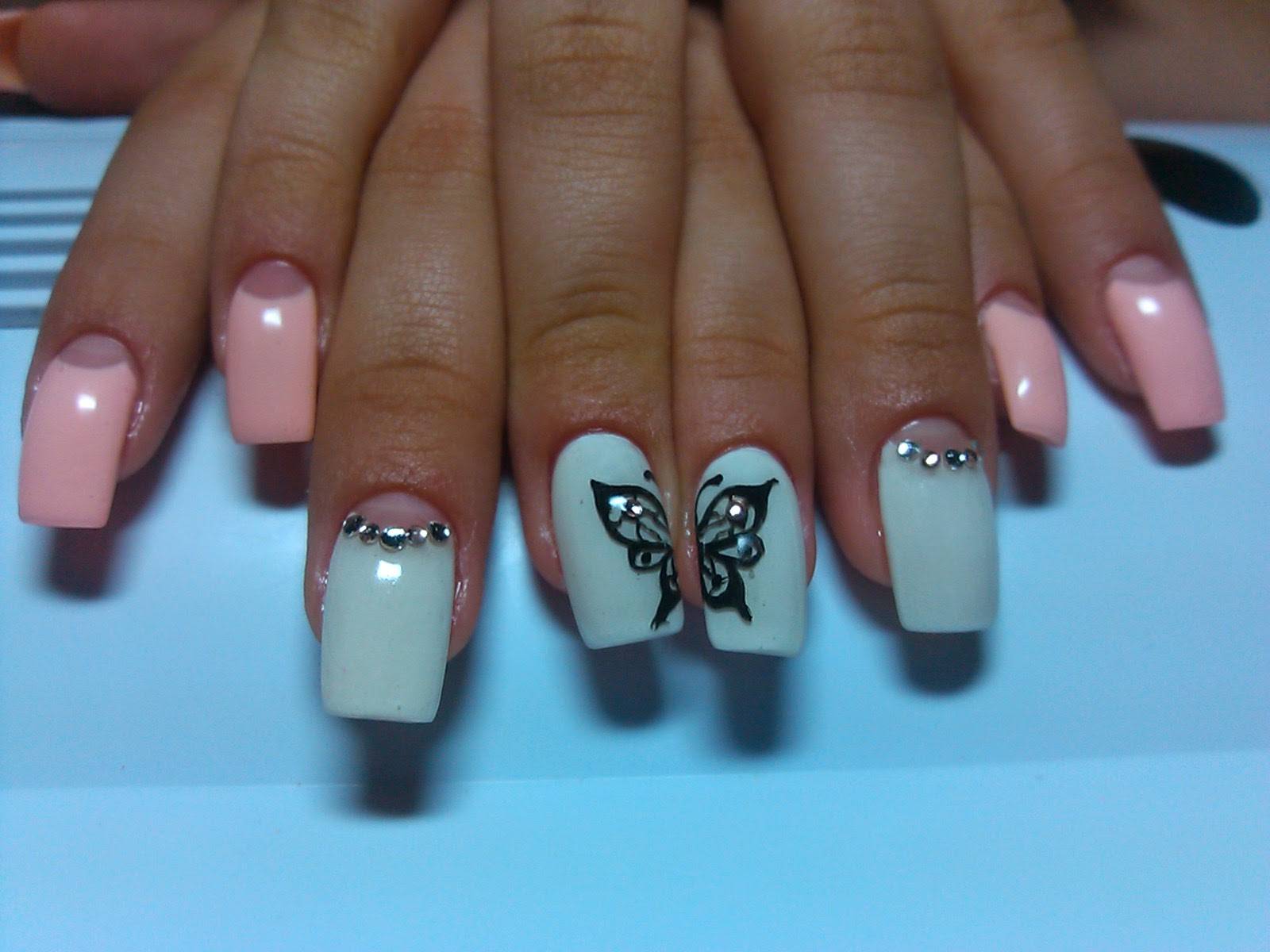 - Теперь можно приступать к прорисовке бабочки. С помощью нескольких оттенков лака рисуем крылья. Обводим контуры и прикрепляем несколько стразов или блесток. Наносим закрепляющий лак