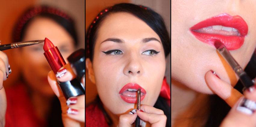 - Идеальный контур либо эффект зацелованных губ. Красная помада требует особой аккуратности в ее нанесении, поэтому, если вам так будет легче, сначала сделайте контур карандашом, и только после этого заполняйте внутреннее пространство цветом. Либо наносите помаду пальчиком, чтобы не создавалось ощущения ее присутствия.