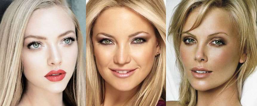 - Макияж для блондинок с зелеными глазами . Здесь предпочтение рекомендуется отдавать различным вариациям светлого макияжа: персиковые, нежно-розовые, жемчужные, сиреневые цвета – лучшие варианты. Для вечера прекрасно подойдут глубокие, матовые коричневые тона либо эксцентричные золотисто-зеленые с блестками.Дисгармонию создаст глубокий яркий розовый тон или синий, особенно, если мы говорим о тенях для век.