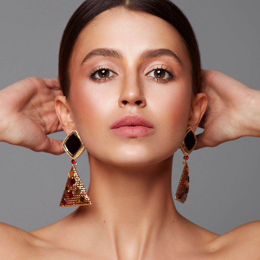 Такой типаж можно легко определить по широкому лбу и узкому подбородку. В этом случае рекомендуется выбирать крупные висячие аксессуары. Это могут быть дуги, серьги-люстры, массивные кисти и т. д. Такой вариант поможет убрать акцент с зоны лба и грамотно «уравновесить» пропорции.