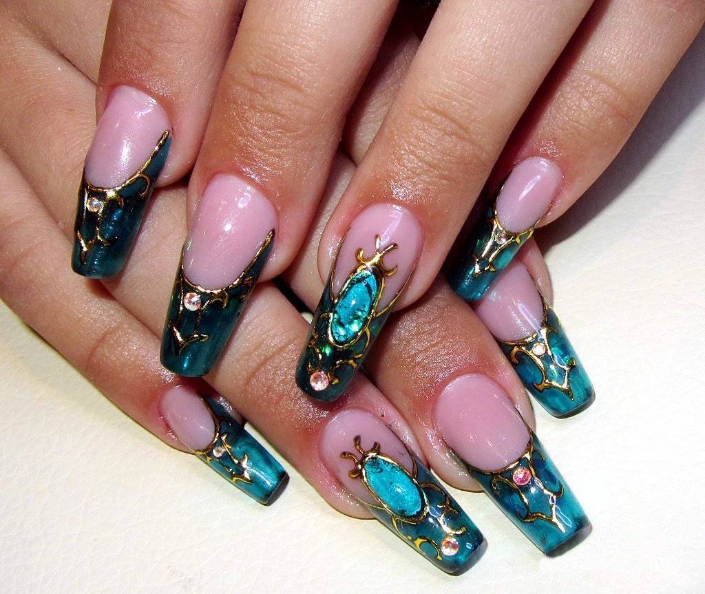 Самым сложным вариантом нейл-арта считается техника литья. Она заключается в нанесении рисунка клеем. После прикладывания и отрывания фольги на ногте появляется объемное блестящее изображение: орнамент, узор, иероглиф, мелкие фигурки.