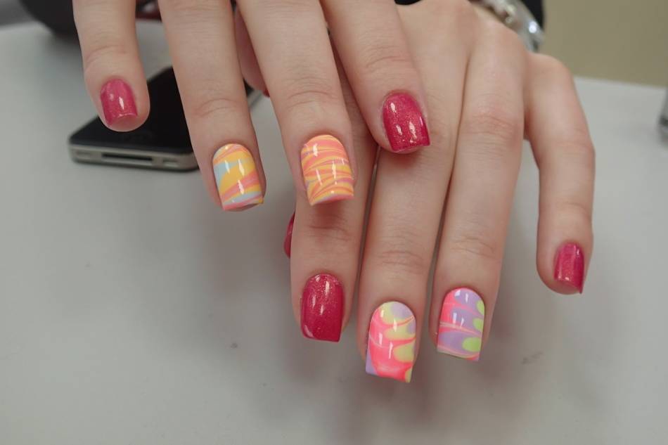 Простой и дерзкий маникюр создается лаками трех или четырех цветов. На основное покрытие нужно нанести разноцветные капельки и затем при помощи зубочистки придать им форму клякс.