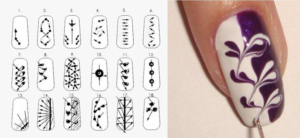 В зависимости от выбранной техники получается разный результат. Рисунок на ногтях иголкой выполняется на мокром лаке, когда покрытие ещё не высохло и его можно соединить в единую композицию. В этом вам помогут рисунки и схемы.