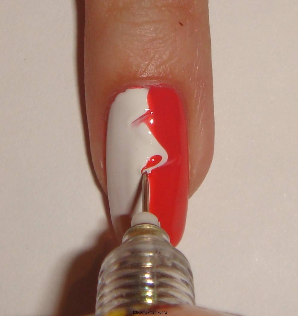 Действие иголкой напоминают знак бесконечности. На одной капле нужно нарисовать восьмерку и соединить ее с нижней капелькой. После того, как ноготь покрыт, рисуем иглой быстро, чтобы лак не успел высохнуть. Рисунок выполняется с применением двух или трех лаков, в зависимости от того, какую композицию желаете получить.