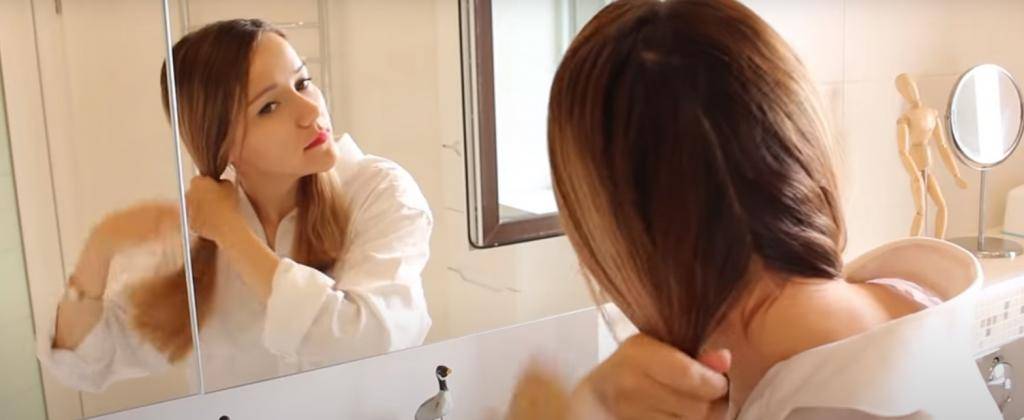 - Расположитесь к зеркалу боком. Выделите левую прядь.