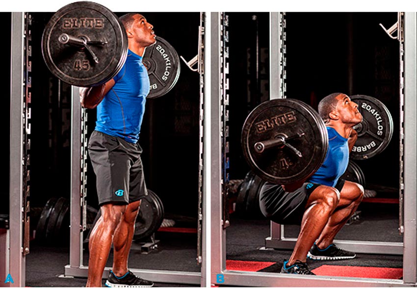Важно тазобедренные суставы опустить ниже коленных суставов. Вернитесь в первоначальную позу и выполните упражнение ещё один раз; Расположив штангу на спине, а ноги на ширине плеч, согните их в коленях