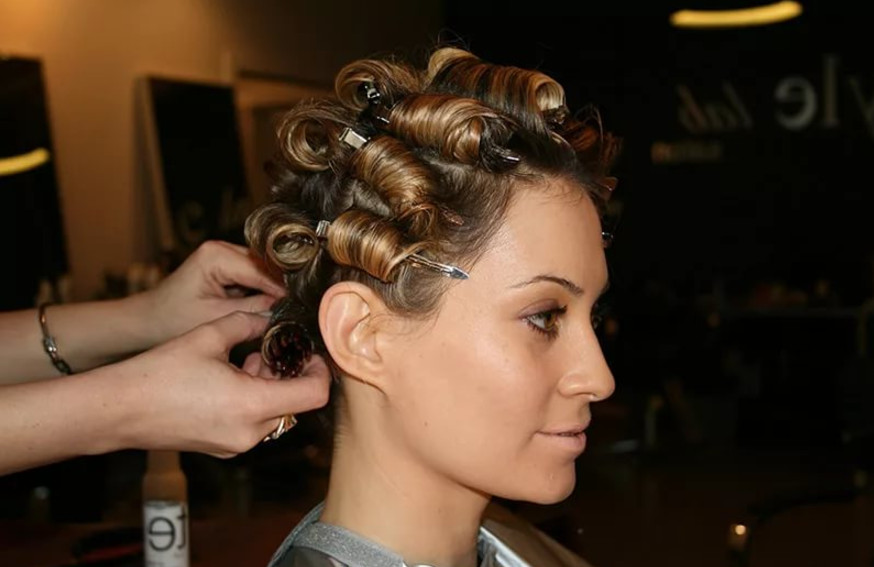 Дальше долговременная укладка волос (Карвинг) переходит в основную фазу: волосы разделяются на пряди, каждая из которых накручивается на бигуди. Мастер использует как бобины одного диаметра, так и разных размеров для придания причёске более естественного вида.