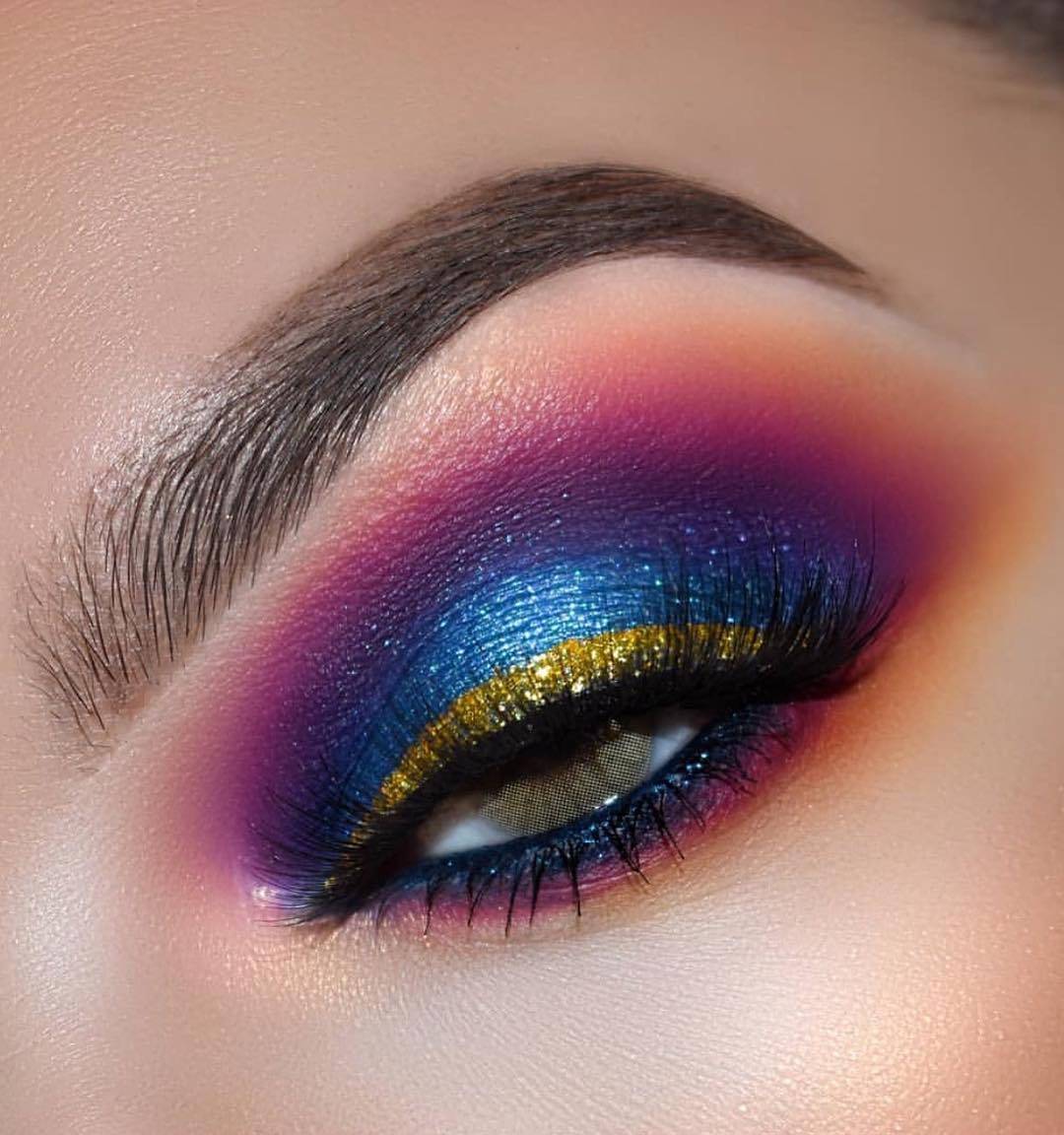Подчеркнуть внутреннею складку подвижного века можно любыми цветами палеток. Например, популярный цвет для выполнения – коричневый. Красить глаза яркими цветами не всегда просто, так как будут видны любые недочеты. Скрыть оплошность коричневыми тенями гораздо легче, чем при выполнении техники cut crease синим цветом. Техника cut crease выполняется всего за пять шагов: