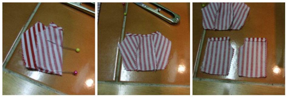 Работая с передними половинками, сперва, втачайте карманы из мешковины. Отстрочите шов с лицевой стороны. Пришейте к мешковине бочки.