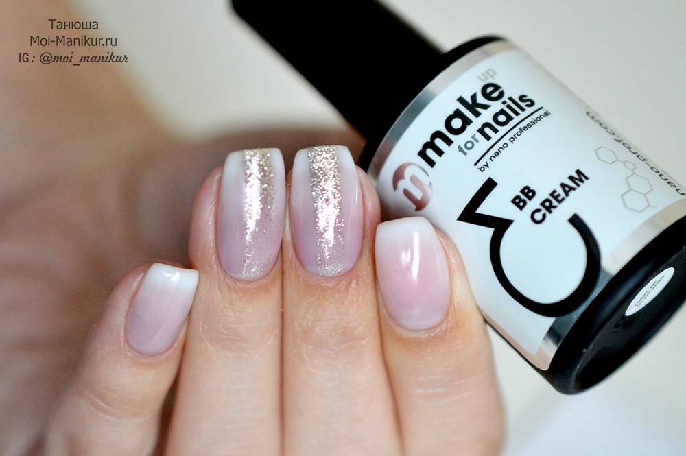 Тонким слоем наносим от кутикулы до свободного края BB Cream. У стыка чуть растягиваем его тонкой кистью и сушим 30 секунд.