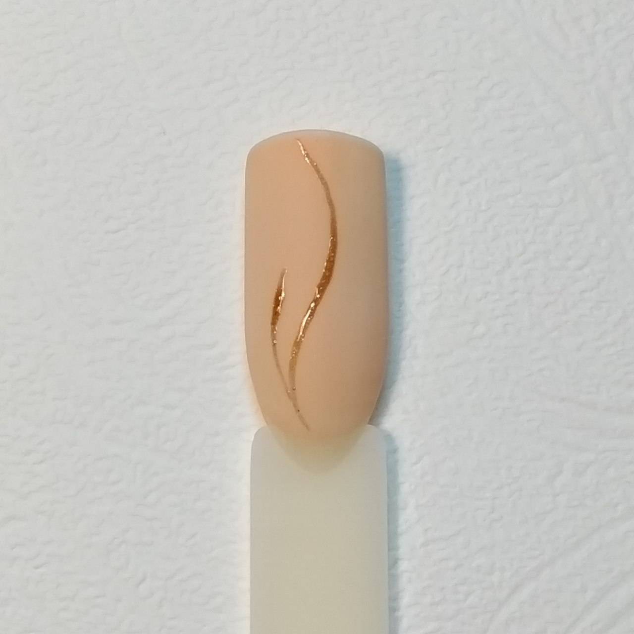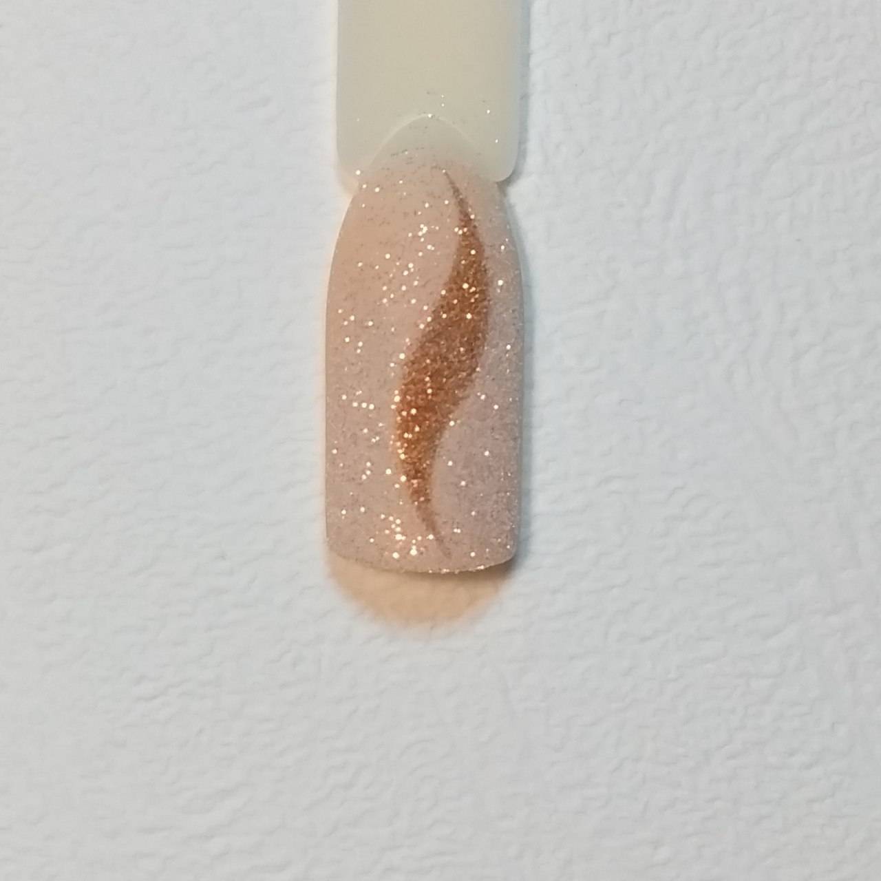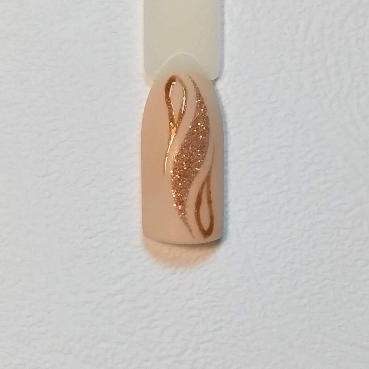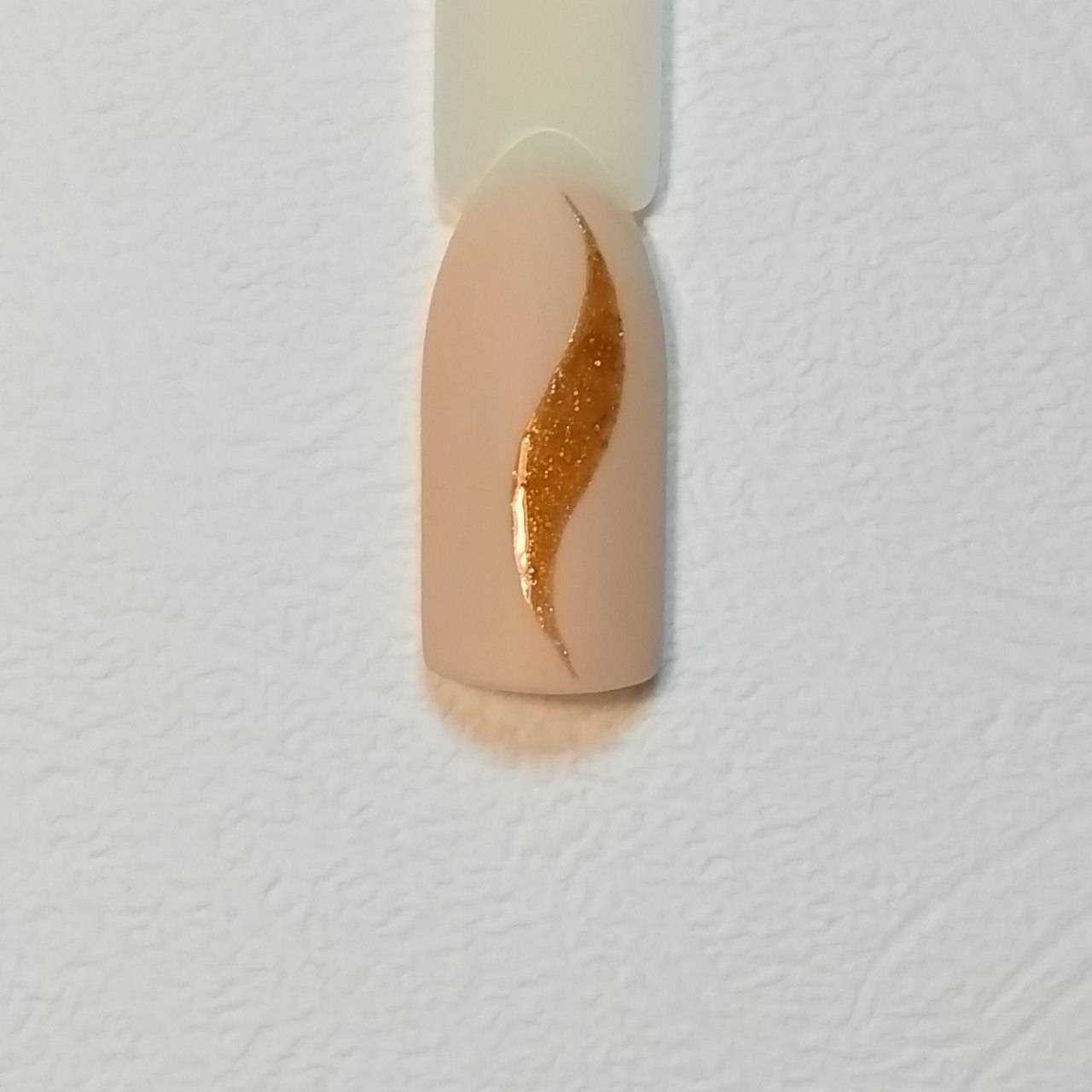 Шаг 2 – Присыпку бархатным песком можно делать на шеллаке, гель-лаке, гель-краске, геле. При создании рисунков удобнее работать с густой гель-краской. Для нашего дизайна возьмем золотую гель-краску с мелким шиммером и кисть с тонким волоском средней длины.
