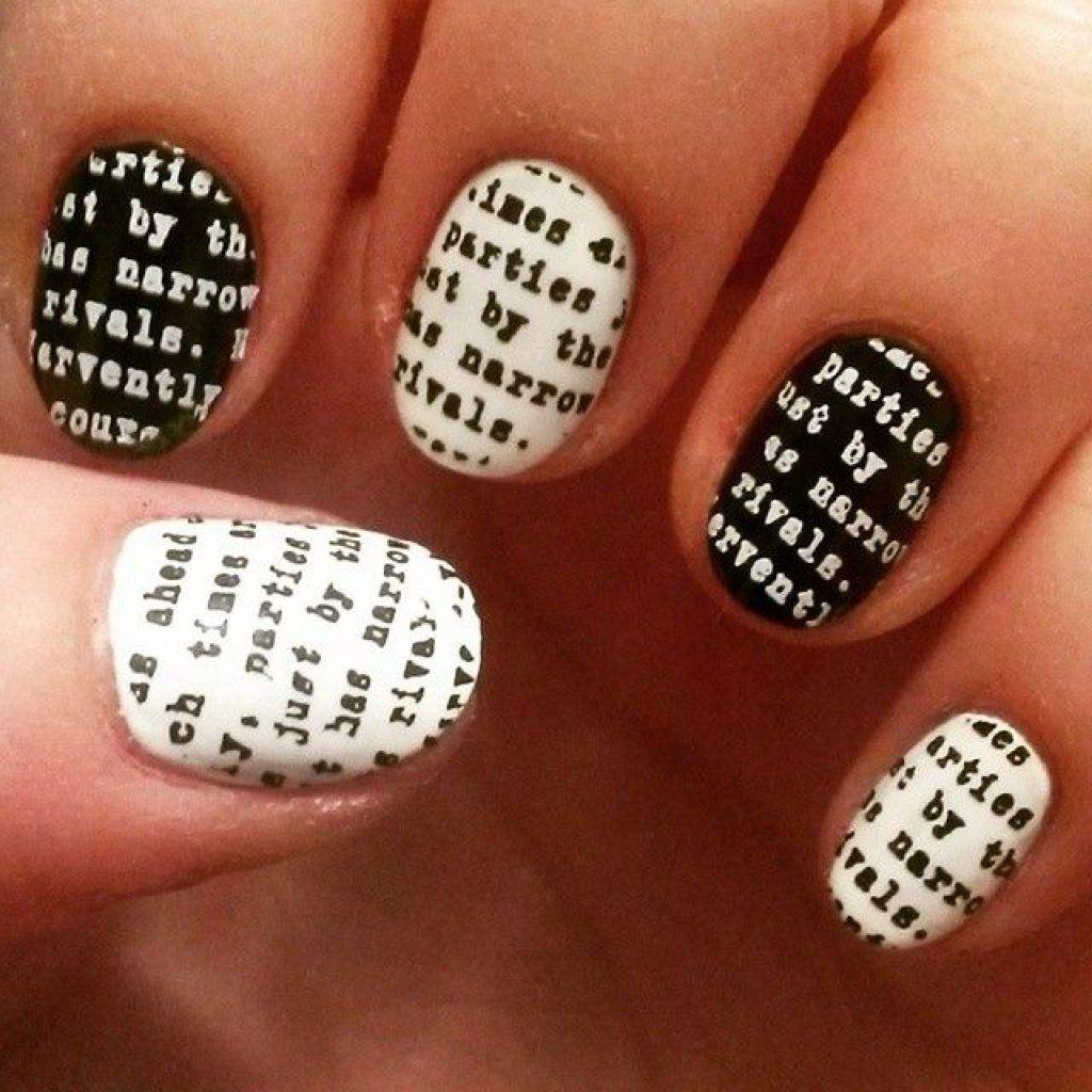 Оригинально выглядит газетный принт в негативном изображении, когда на чёрной основе отпечатан шрифт белого цвета. Для создания такого маникюра необходимо найти в печатных изданиях текст на тёмном фоне либо самостоятельно распечатать белые буквы на чёрной бумаге.