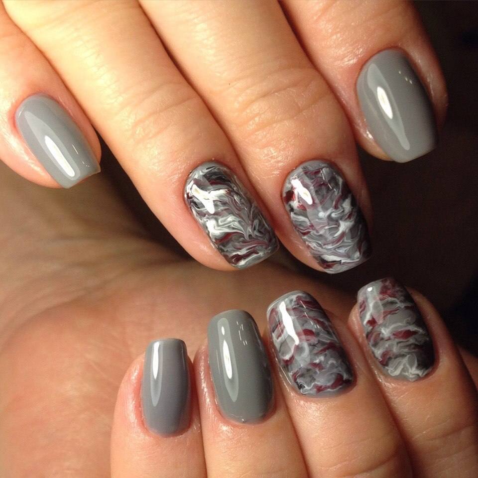 Главная особенность маникюра с разводами – эффект объемной дымки на ноготках. Причем цветовое решение может быть самым разным в зависимости от собственных предпочтений. Чаще всего девушки выбирают оформление в черном или сером цвете. Это идеальный вариант для вечернего образа с элегантным нарядом. Допустимы и другие цветовые сочетания.