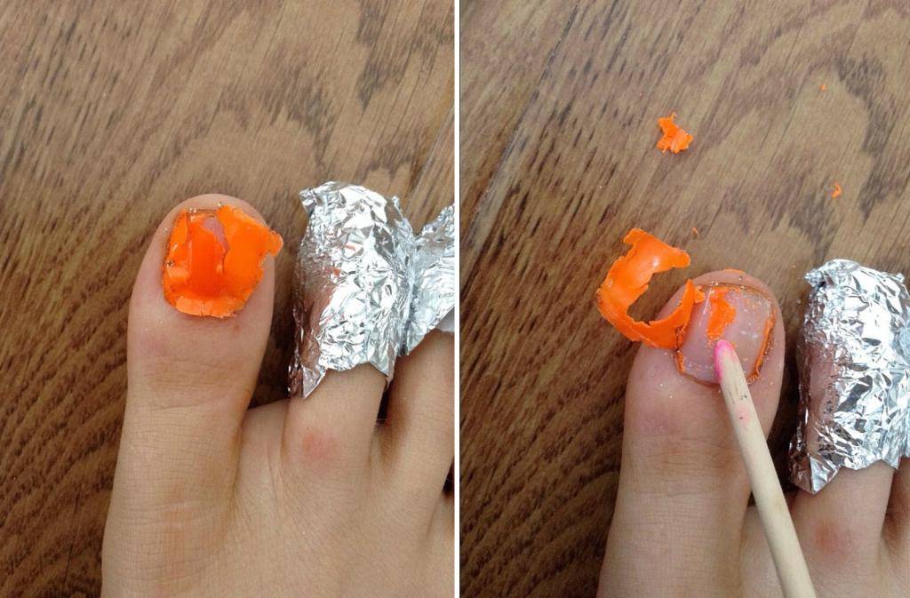 - Через 10-15 минут убрать всю конструкцию с ногтей и соскоблить отслоившееся покрытие при помощи апельсиновой палочки.