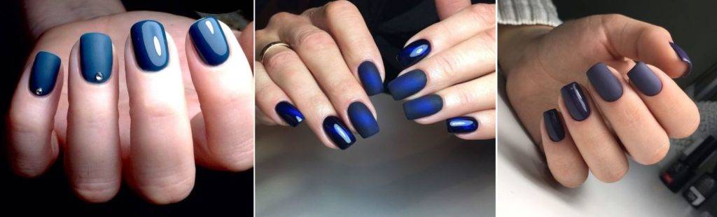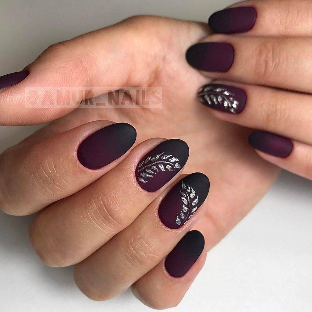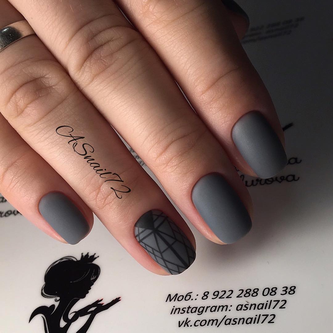 Особенно хорошо смотрится неблестящий лак темных цветов. Можно выбрать классический стильный монохром, а можно сочетать бархатную основу с глянцевыми деталями, с рисунком: